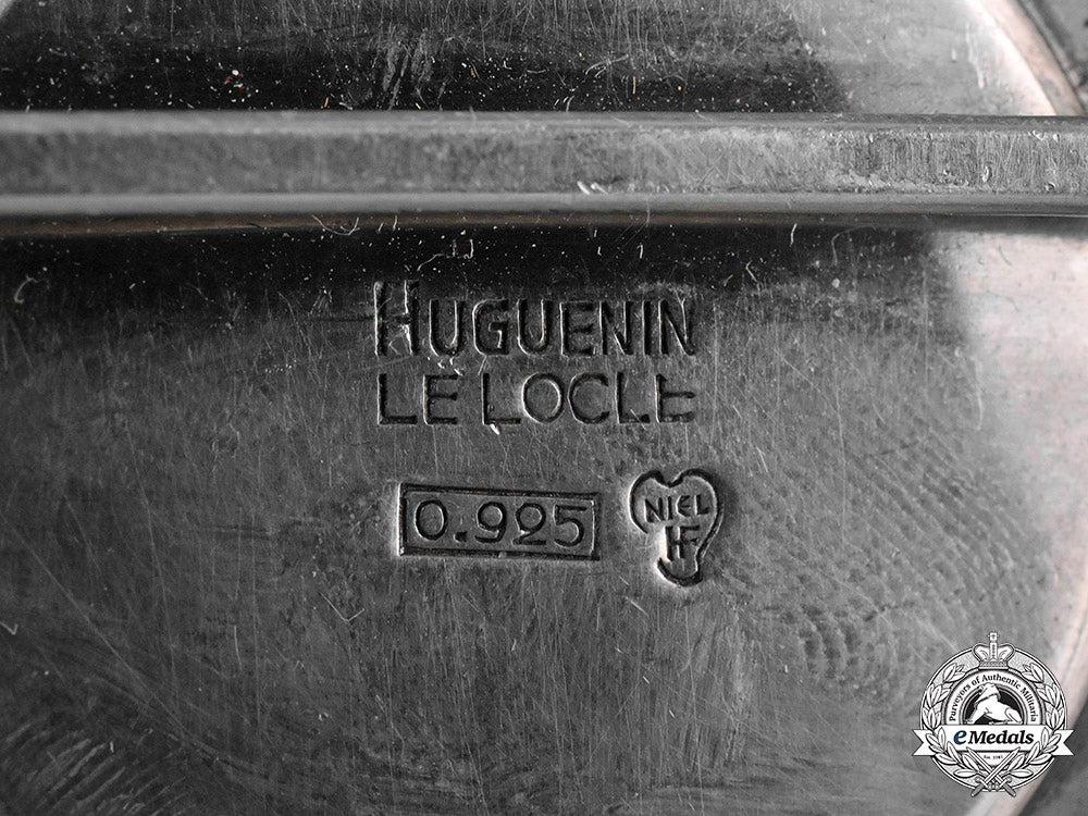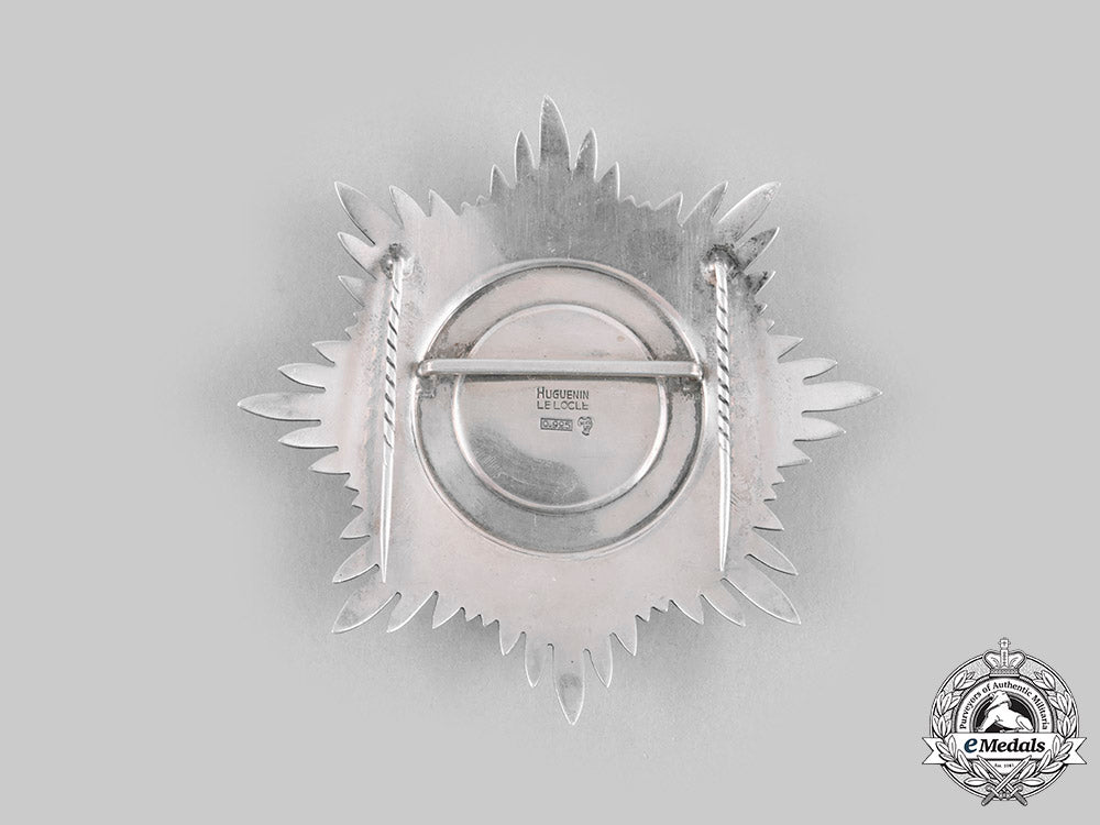 An eight point silver star with clusters of seven smooth rays, the obverse centerpiece presents a left facing profile of Simon Bolivar in silver gilt, surrounded by concentric rings of enamel in green, red, white, blue and yellow, the reverse presents dual stays with a central horizontal bar, the cartouche is maker marked HUGUENIN LE LOCLE with a .925 silver mark and a NIEL HF mark (denoting the maker and the art nouveau design), measures 87.34mm (w) x 86.33mm (h), weighs 76.7 grams, enamel rings intact, light tarnishing between rays, 12 and 2 o’clock rays slightly bent, overall very fine condition