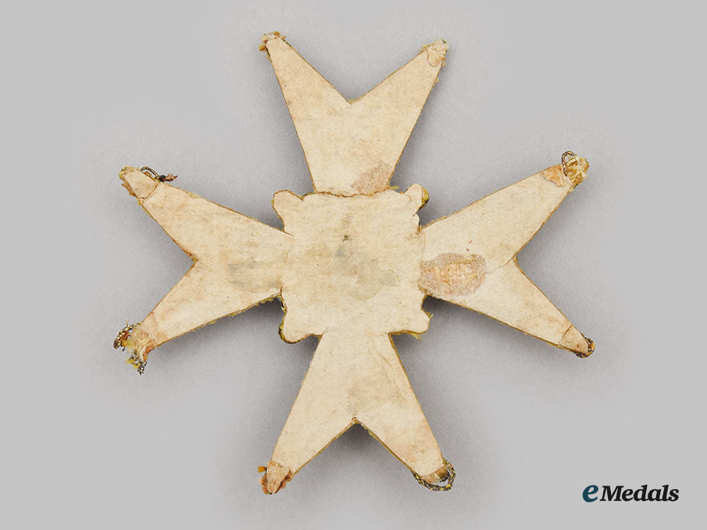 The embroidered star of the order, comprising a red foil Maltese cross with bullion wire and sequins detailing the obverse arms, with lillies represented by sequins and a threaded background, with a reinforced paper backing, measures 58.96mm (w) x 58.85mm (h), weighs 2.3 grams, fraying to thread and bullion at multiple arm tips, glue residue on reverse, with light cracking and wear to backing, remains in very fine condition.