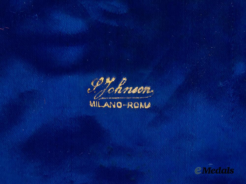 The full-size award, miniature, and boutonniere are all contained within its presentation case, constructed of a lightweight wooden frame with a red leatherette exterior liner, the exterior of the lid with a gilded Royal Crown and the Royal cypher of King Vittorio Emanuele, the interior of the lid lined with dark blue silk blended fabric marked S. Johnson Milano-Roma, with a functional exterior metal hinge, intact interior fabric hinge cover, functional exterior metal clasp, and recessed medal bed for placement of the award, miniature, and boutonniere, measuring 110 mm (w) x 134 mm (l), scuffs and damage to the exterior, hinge and catch functional, in very fine condition.
