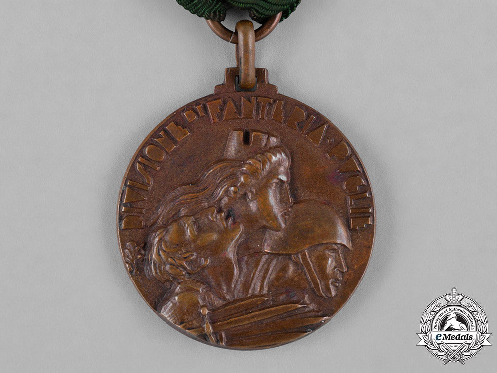 In bronze, obverse illustrating a woman representing Victory, flanked by a man looking skyward on her right and a helmeted soldier on her left, a castle tower in the background, with four swords in the foreground below, inscribed in Art Deco style text "DIVISIONE di FANTERIA PVGLIE" and engraver marked "AFFER", reverse illustrating an upward-pointing sword wrapped in a flame upon a pedestal, with mountains in the background, inscribed in Art Deco style text "MONASTERO.Q731" with an under rule, with an arrow extending from the under rule and pointing to the mountain below, measuring 32.3 mm in diameter, original ribbon, extremely fine.