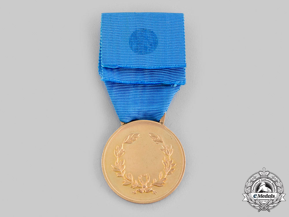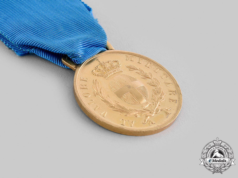 (Medaglia d'oro al valore militare). Instituted in 1793. In bronze gilt, measuring 35.5 mm (w) x 41.3 mm (h) inclusive of its integral suspension, edge nicks, light contact, original ribbon, better than very fine.