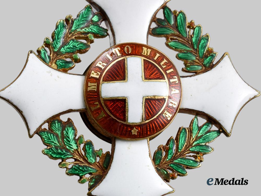 Instituted August 14, 1815. Type II (1855-1946). In 18K Gold, a white enamel cross with green enamel segments in each quadrant, the obverse medallion featuring crossed swords and the date 1853 with royal initials VE, the reverse medallion presenting a white enamel cross on red enamelled field, encircled by the inscription AL MERITO MILITARE, suspended by a trophy of arms suspension denoting officer class, measures 36.25 mm (w) x 58.1 mm (h - inclusive of trophy of arms suspension), weighs 11.54 grams, worn on original ribbon with button on reverse, hairline cracks in white enamel, light contact marks, a scarce decoration in extremely fine condition.