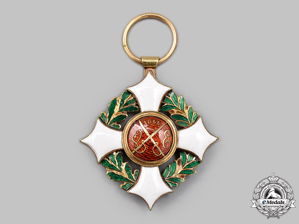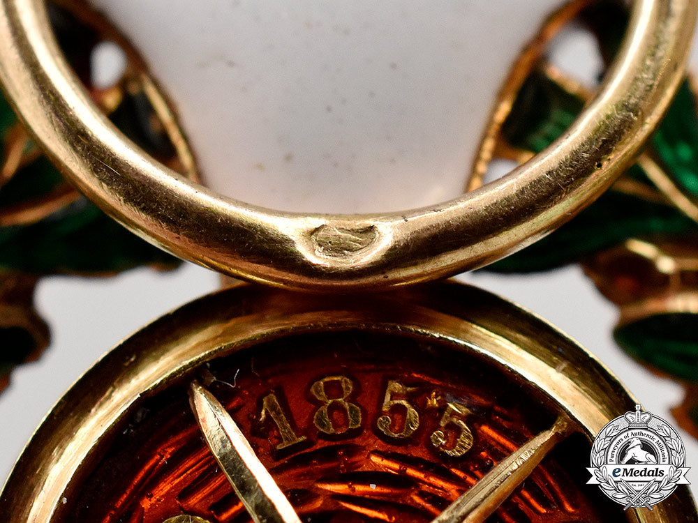 (Ordine Militare di Savoia). Instituted in 1815 and revised in 1855. Four-piece construction, in 18K Gold with red, white and green enamels, excellent quality, weighing 8.5 grams, measuring 35 mm (w) x 35 mm (h), intact enamels, extremely fine.