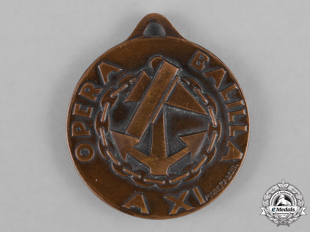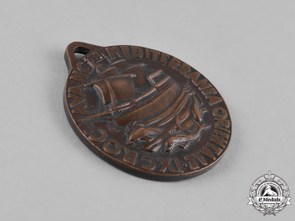 (Opera Nazionale Balilla). In bronze, obverse illustrating a three-masted ship with the sails released, three dolphins swimming in the waves below, surrounded by the inscription "IX CROCRA AVANCITI MEDITERRANEA ORIENTALE", reverse illustrating an anchor fronted by a stylized fasces butting a pennant, within a circle of chains, surrounded by the inscription "OPERA BALILLA A XI" and engraver marked "MORESSCALCHI.", measuring 34 mm in diameter, extremely fine.