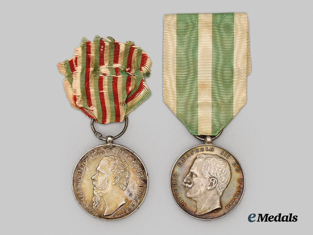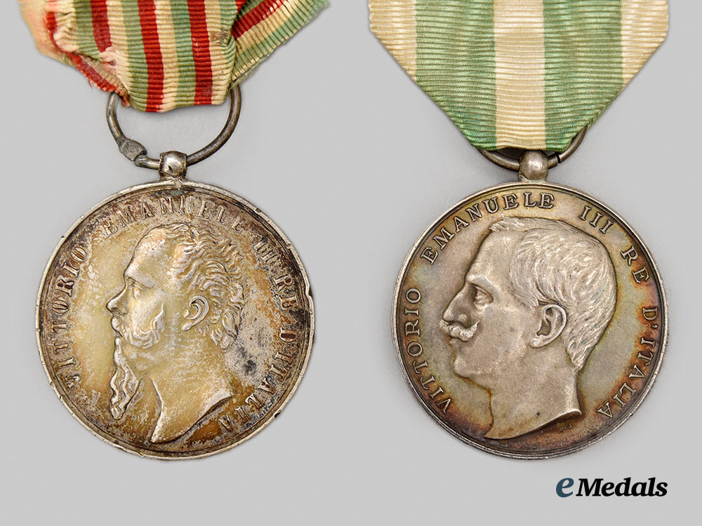 2. Italy, Kingdom. A Medal for the Wars of Independence & the Unity of Italy,, c.1866 (Medaglia per le guerre d'Indipendenza e l'Unità d'Italia). Instituted 1865. Circular medal in silver, obverse bear the left facing head portrait of Vittorio Emanuele II and “VITTORIO EMANUELE II RE D’ITALIA” (VITTORIO EMANUELE II KING OF ITALY), the reverse centre bears a crowned woman figure holding a spear and shield and is inscribed with “GUERRE PER L’ INDIPENDENZA E L’UNITA D’ITALIA” (WARS FOR INDEPENDENCE AND UNITY OF ITALY), on a green, white and red striped ribbon, measuring 32 mm (w) x 35 mm (h), very fine.