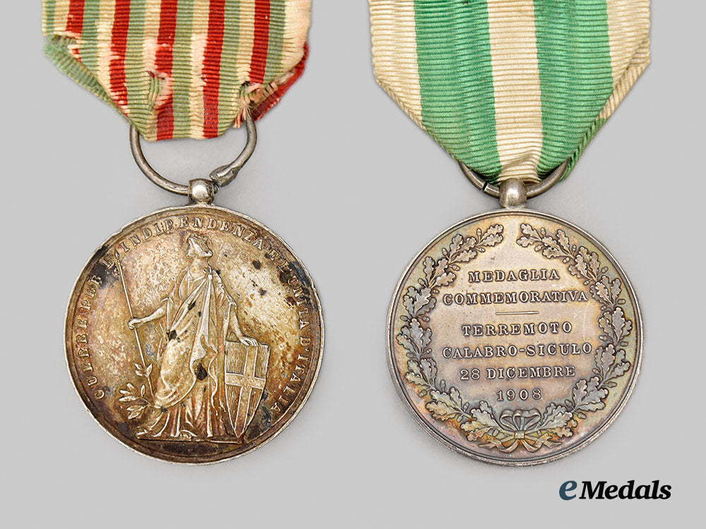 1. Italy, Kingdom. A Merit Medal for the Messina Earthquake 1908 (Medaglia commemorativa al merito per il terremoto di Messina 1908.) Instituted in 1910. In silvered zinc, engraver marked "S.J" on the obverse, measuring 31.5 mm in diameter, spotting, original ribbon, in fine condition.