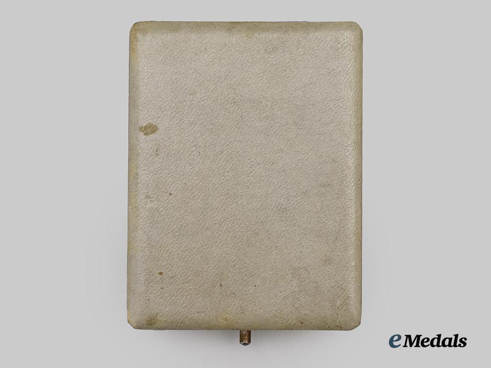 (Ordine della Corona d’Italia). Instituted February 20th, 1868. Constructed of 18kt Gold, with blue, green, red, and white enamels, suspended from a fixed loop and swivel ring suspension from its period original ribbon, consisting of a white-enameled hollow construction Gold cross with Gold knots in the quadrants between the arms of the cross, the obverse with a blue enameled centerpiece bearing a royal crown constructed of white, green, and red enamels, surrounded by a Gold ring, the reverse features a Gold central medallion bearing a black enameled eagle with a red and white enameled shield on its chest, surrounded by a matching Gold ring, unmarked, measuring 36.5 mm (w) x 38.5 mm (h - inclusive of integral ring), weighing 12.42 grams with ribbon, near mint.