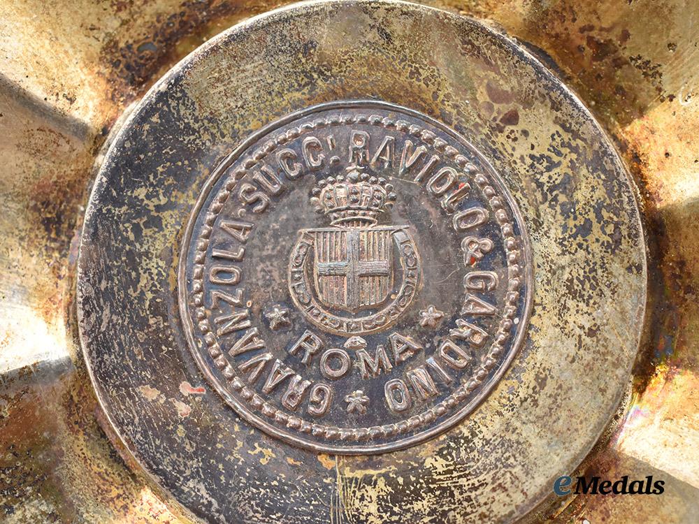 Accompanied by a Grand Cross Star,in silver, an eight point star featuring clusters of alternating smooth and faceted rays, the obverse medallion featuring a Lombardy crown on a blue enamelled field, surrounded by a gold ring then a white ring inscribed VICT. EMMAN. II. REX. ITALIAE. MDCCCLXVI, encircled by a ring of gilt facets, surmounted by a black enamelled eagle on the 12 o’clock arm, reverse presenting a vertical pin suspension, the cartouche of CRAVANZOLA SUCC. RAVIOLO GARDINO ROMA, measures 89.3 mm (w) x 89.3 mm (h), weighs 74.17 grams, enamels intact, medallion and cartouche loose and will spin, hinge and clasp functional, in extremely fine condition.