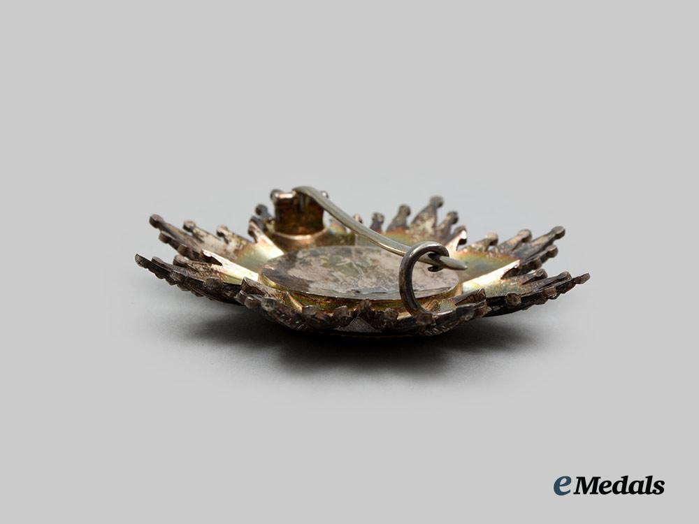 The Star of the order, in silver featuring an eight point star with alternating faceted and smooth rays, the obverse medallion featuring a Lombardy Crown on a blue enamelled field, surrounded by a white enamel ring inscribed VICT. EMMAN. II . REX. ITALIAE. MDCCCLXVI, a black enamelled eagle on the 12 o’clock arm, the reverse with a vertical pin, measures 79 mm (w) x 79 mm (h), enamels intact with the exception of a missing section of the blue enameled central field, otherwise in near extremely fine condition.