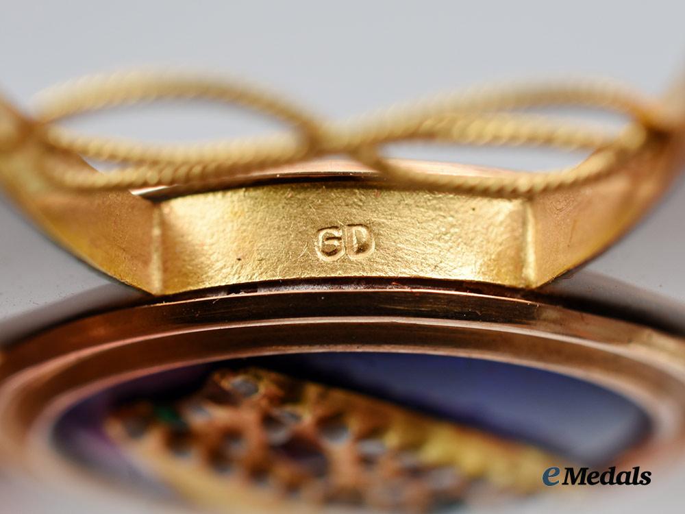(Ordine della Corona d'Italia). Instituted in 1868. Consisting of the badge of the order, a white enamel cross with Savoy knots in each quadrant, the center medallion with a Lombardy Crown on blue enamels, reverse bearing a black enamelled eagle, measures 49.8 mm (w) x 53.7 mm (h - inclusive of integral ring), weighs 16.3 grams, accompanied by a full length, original sash, enamels intact, in extremely fine condition.