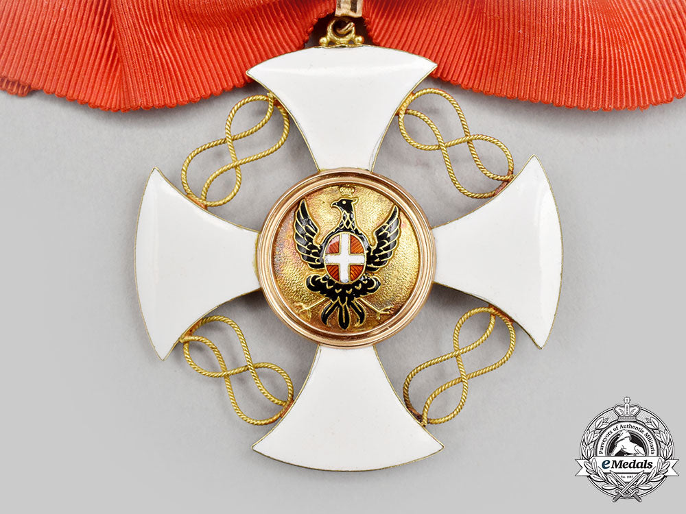Footnote: The Order of the Crown of Italy was founded as a national order in 1868 by King Vittorio Emanuele III, to commemorate the unification of Italy in 1861. It was awarded in five degrees for civilian and military merit: Knight Grand Cross, Grand Officer, Commander, Officer and Knight. Compared with the older Order of Saint Maurice and Saint Lazarus (1572), the Order of the Crown of Italy was awarded more liberally and could be conferred on non-Catholics as well. Eventually, it became a requirement for a person to have already received the Order of the Crown of Italy in at least the same degree before receiving the Order of Saints Maurice and Lazarus. The order has been suppressed by law since the foundation of the Republic in 1946.