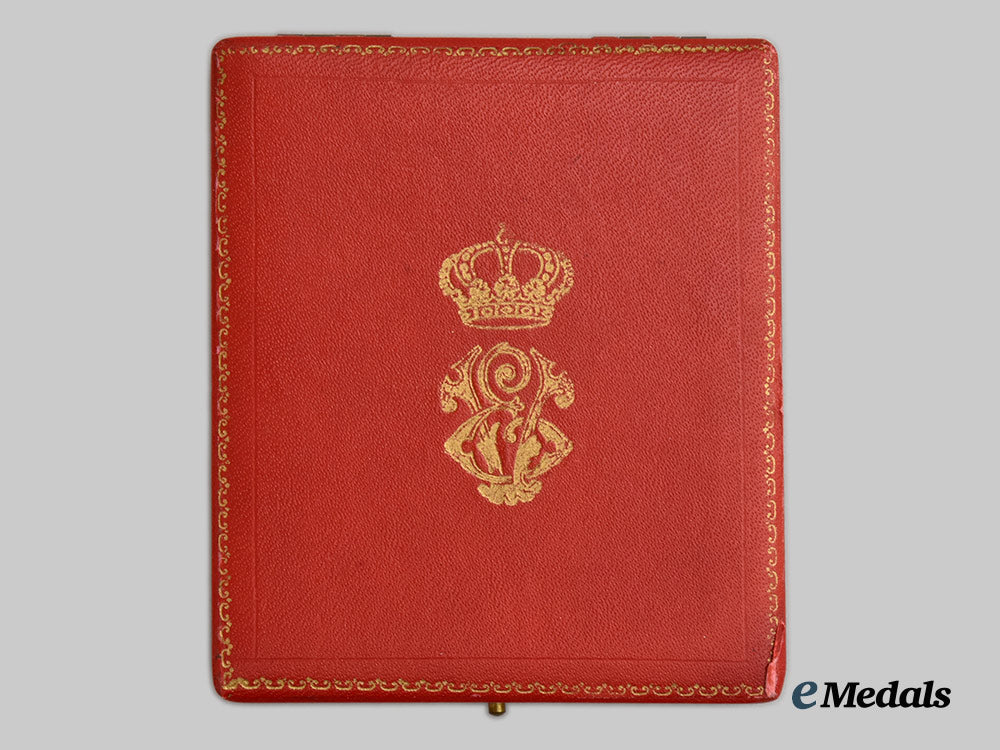 Instituted in 1868. Cross in white enamel linked with gold rope, obverse centre shows a band with Italian beaded colours, reverse shows Savoy cross imposed on a black eagle with gold background, neck ribbon divided into three bands, inclusive of loop 53 mm (h) x 37.9 m m (w), fine condition. Miniature with rosette, 26.2 mm (h) x 18.6 mm (w), evidence of chipping on obverse lateral cross arms, very fine condition. Housed in original case, very fine condition.