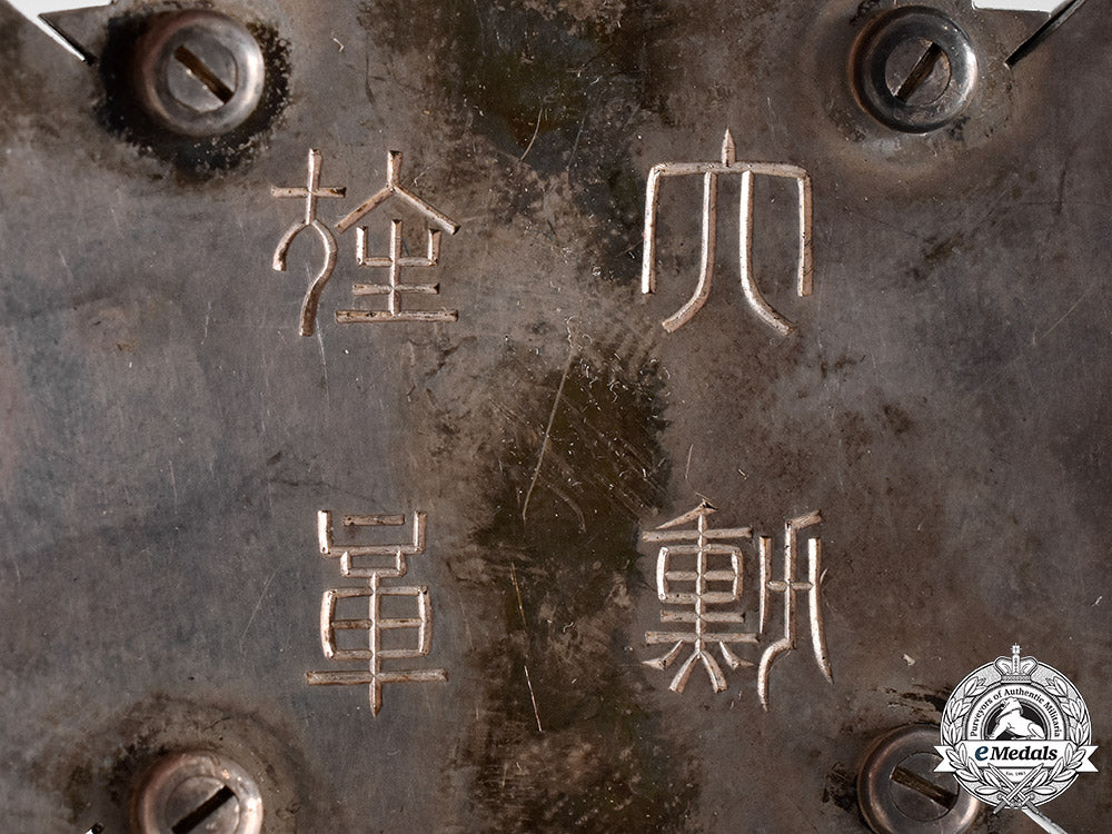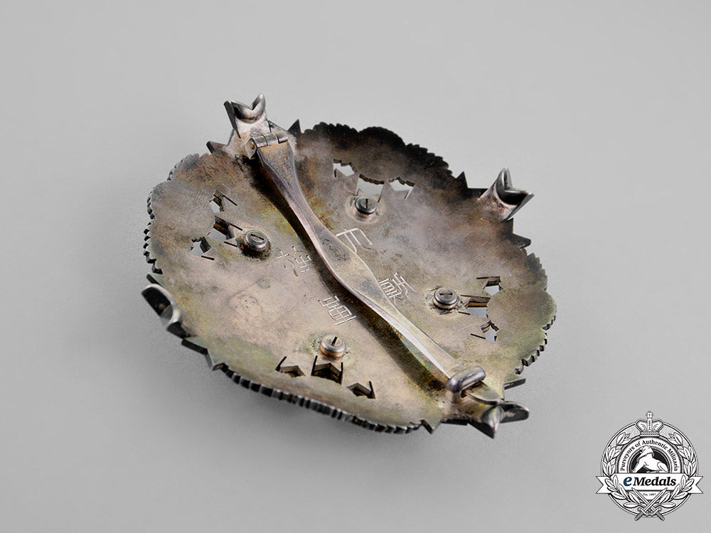 Accompanied by the star of the order, consisting of a large silver four armed multiple ray cross, with yellow and green enameled Chrysanthemums in each quadrant, superposed by an enameled white symbol of the Rising Sun, with central medallion consisting of a beautiful red glass cabochon, measuring 85.65 mm (w) x 89.61 mm (h), reverse with flat pin assembly and Japanese characters, with hairline cracks and enamel loss to rays, with ray tips pushed inwards from wear, good/fine.