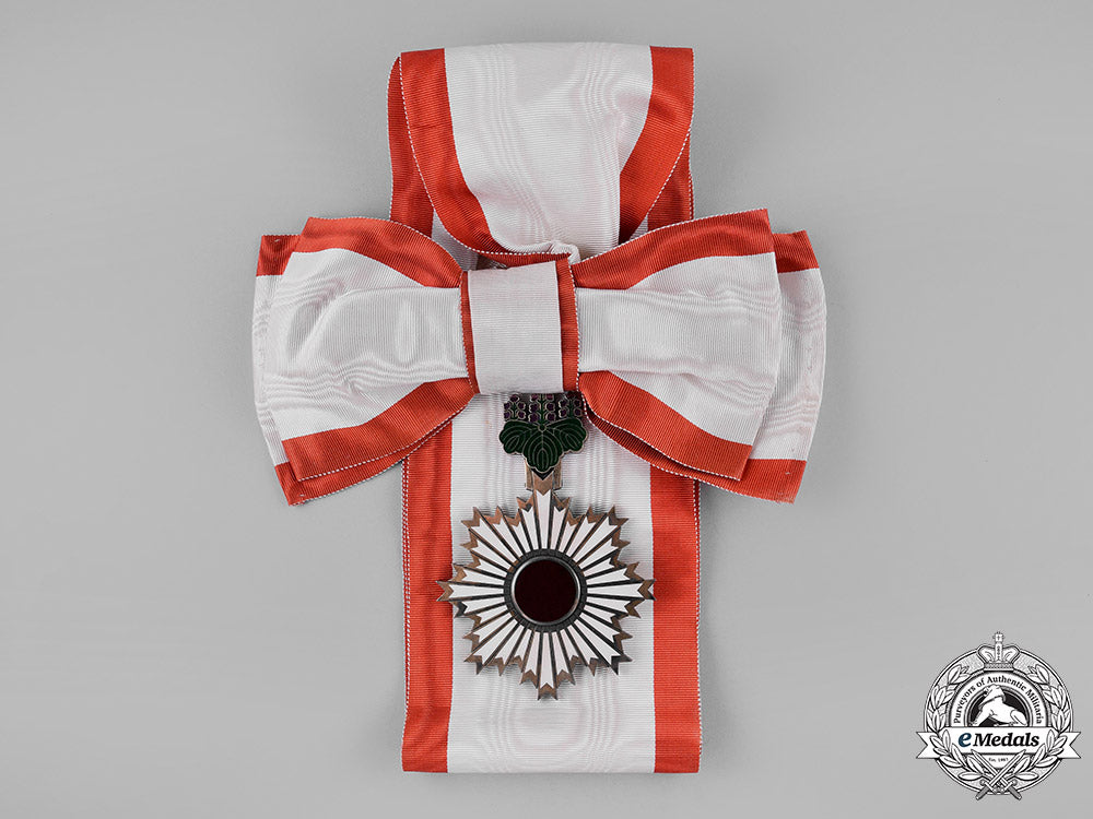 Instituted in 1875. Sash Badge: in silver gilt with white, green and violet enamels, centre red glass cabochon, measuring 76 mm (w) x 114.5 mm (h) inclusive of its Paulonia flowers suspension, with an original full-length sash; and Breast Star: insignia in silver gilt and white enamels with a centre red glass cabochon, mounted to an eight-pointed star base, measuring 91 mm (w) x 91 mm (h), vertical pinback flanked by dual stays, dark patina. Intact enamels, extremely fine.
