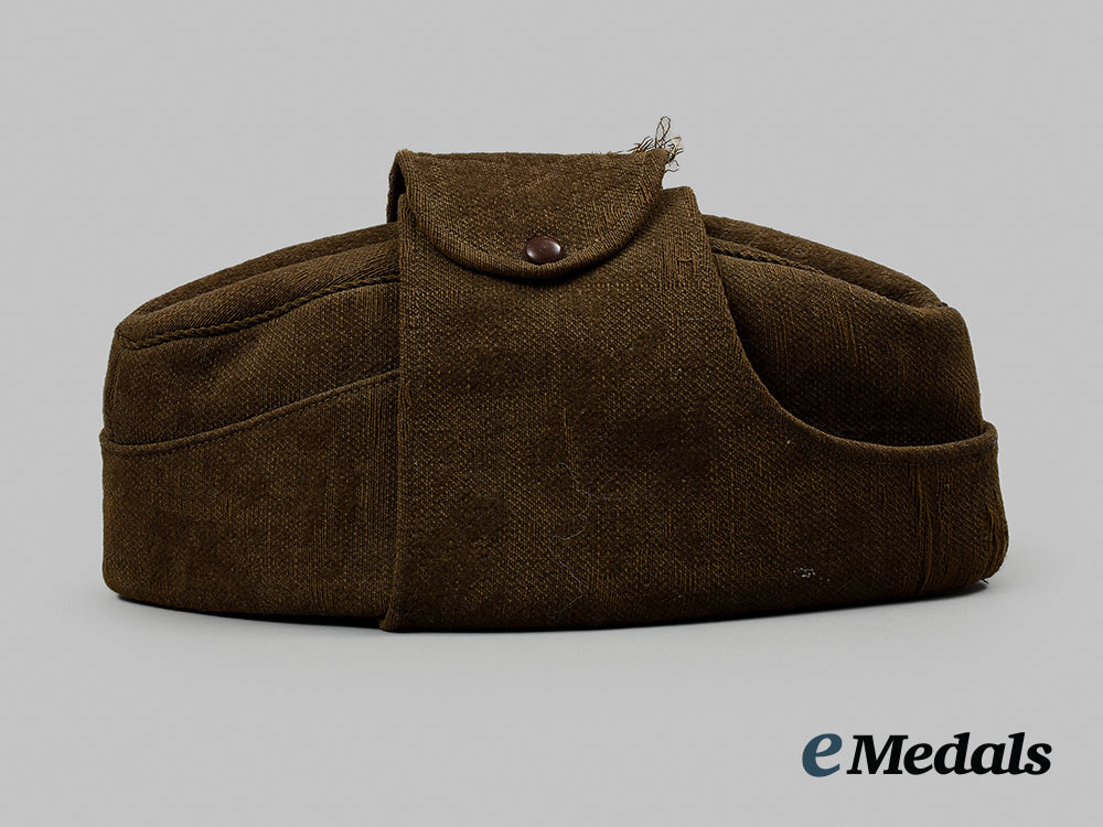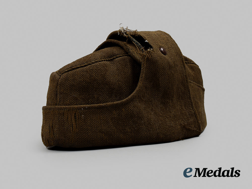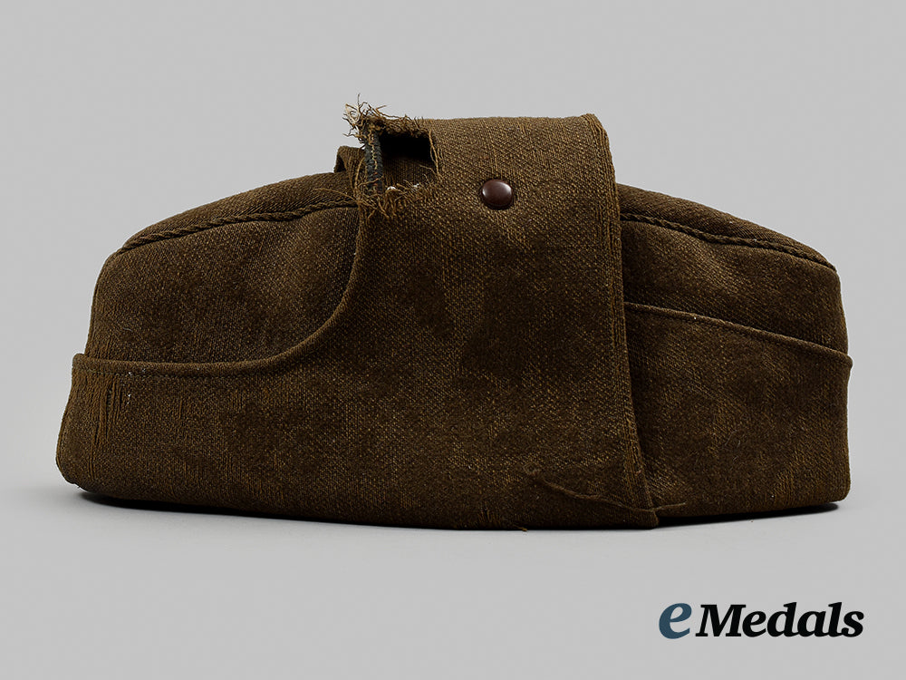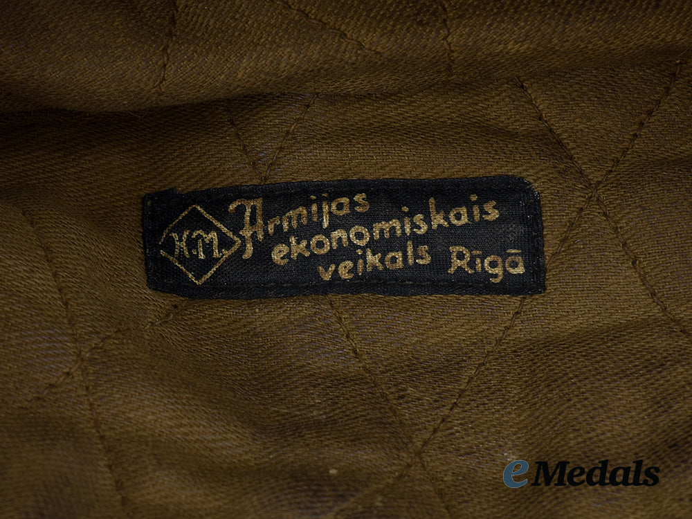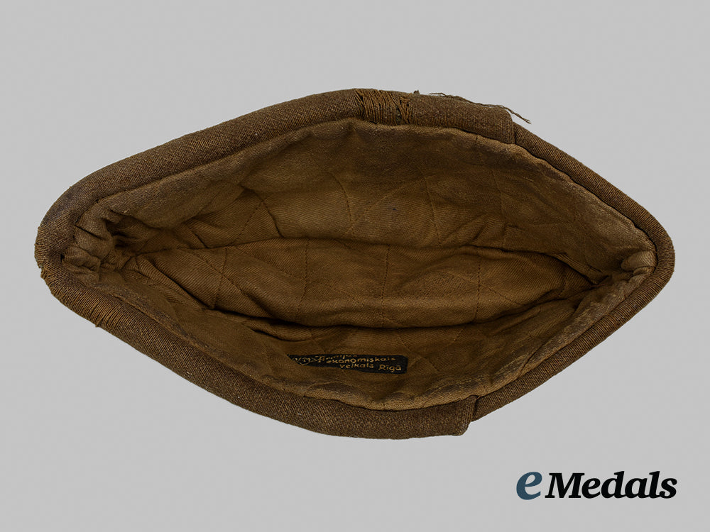 Fabric of the cap shows mothing and the fabric demonstrates heavy wear, the interior exhibits wear, and has a “ KM Armijas Ekonomiskais Veikals Riga ” (translation: Army Economic Store) label, measuring at 29.5cm (w) x 14cm (l)x 2.5cm (h) and weighing at 184.6 grams, as worn.