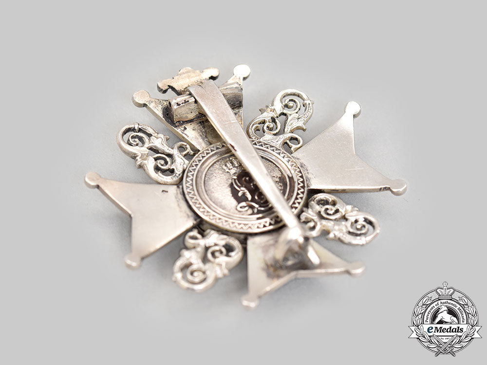 (Leopold Orden). Instituted 1869 by Prince Leopold IV. Type II (1910-1916). A silver Maltese cross with purple enamelled arms and ball finials, between each arm is a large silver monogrammed L, the obverse medallion presents a light pink enamelled rose with five petals on a white enamelled field, surrounded by a silver ring inscribed FUR VERDIENST (For Merit), a decorative silver petal sits in the knee of the 12 o’clock arm, the reverse bears a single vertical pinback, with a decorative medallion featuring a crowned L monogram, measures 47.15mm (w) x 49.25mm (h), weighs 24.2 grams, enamel damage to two of the central petals, patina wear to reverse medallion, a rare decoration (1 of 16), in extremely fine condition.