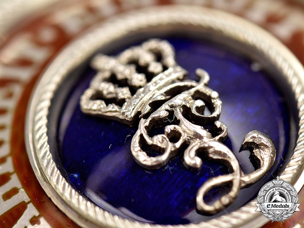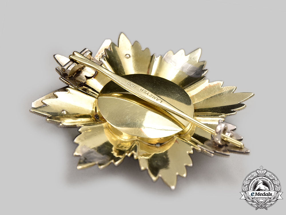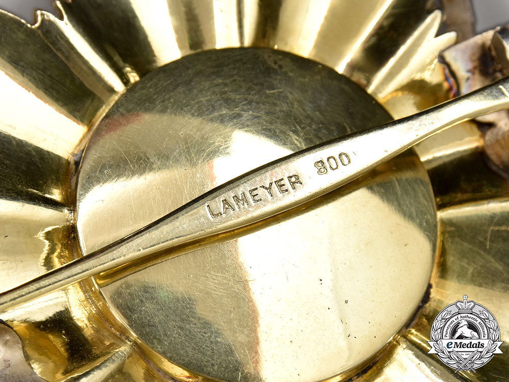 (Haus und Verdienstorden von Herzog Peter Friedrich Ludwig, Großkreuz). Issued 1838-1918. A breast star consisting of an eight-pointed rayed silver star; the obverse with a central blue enamelled medallion depicting a silver crowned cipher of Peter Friedrich Ludwig, surrounded by a silver knurled ring bordering a broad ring of red enamels, inscribed “Ein Gott-Ein Recht-Eine Wahrheit” (German - One God, One Righteousness, One Truth), at the top of the award affixed is a pair of crossed silver swords, the reverse gilded but plain, with a vertical slender banjo style pinback, with a barrel hinge and a broad catch, the catch marked “LAMEYER” as well as with “800” for silver content, measures 82.6mm (w) x 81.8mm (h), weighs 73.1grams, enamels intact, wear to gilding on reverse, a scarce decoration in extremely fine condition.