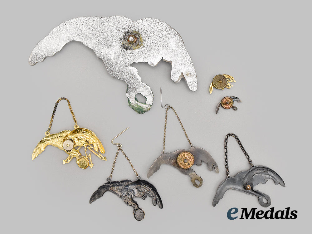 7. Pilot Badge Plaque: in silvered metal, green paint on the wreath, black paint on the claws and beak, along with red paint representing the eagle's eye, magnetic, measuring 148 mm (w) x 83.5 mm (h), intact screwpost.