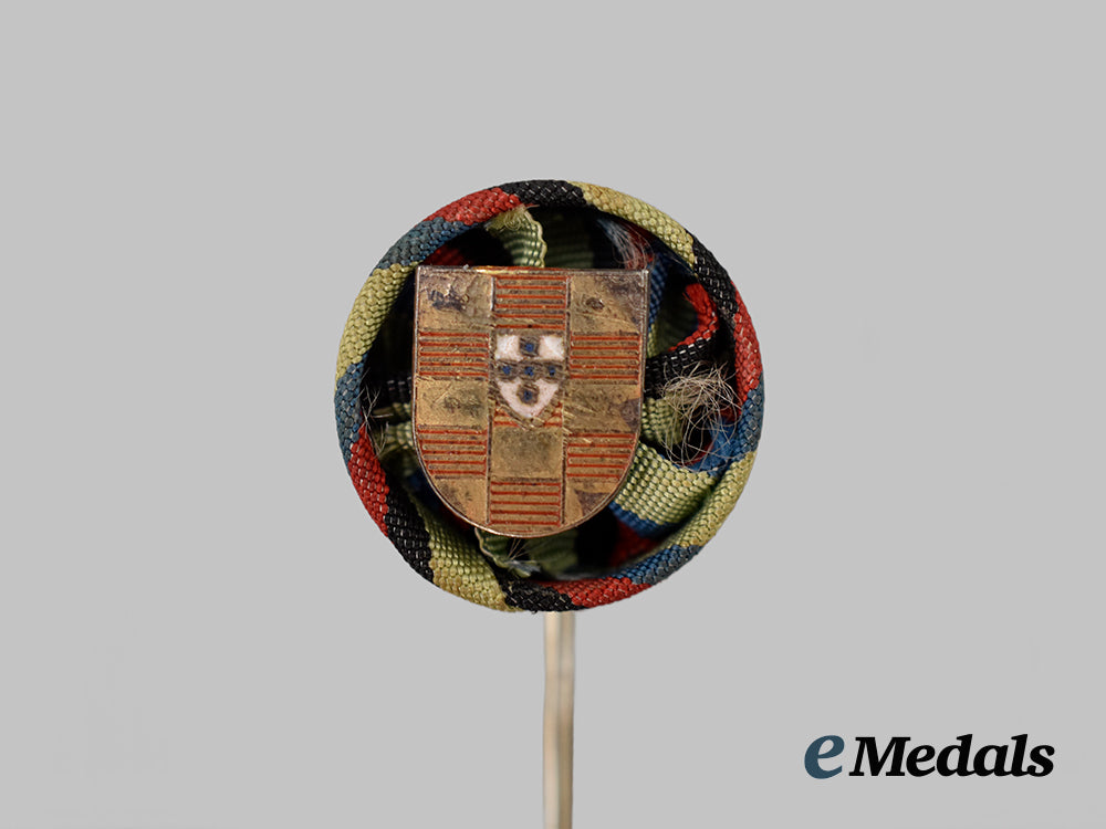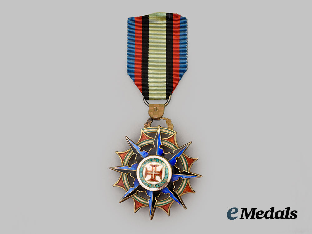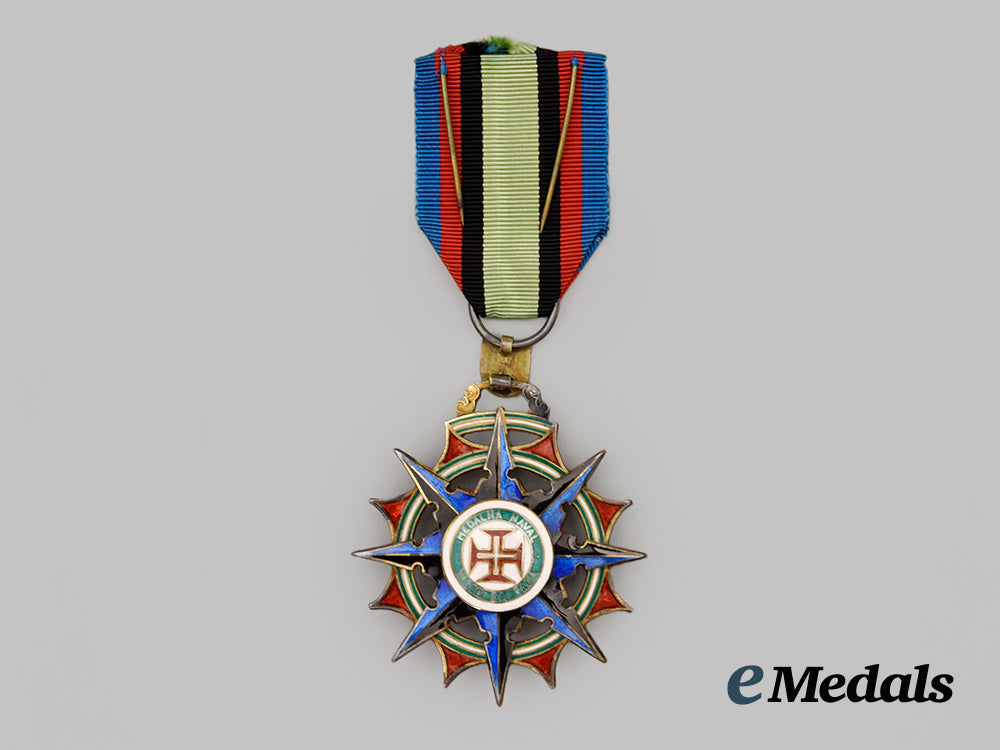 (Medalha Naval Vasco da Gama). Instituted 11th of June 1969. Compass design, obverse and reverse centre show cross surrounded by ring in green enamel and the inscription, “Medalha Naval Vasco da Gama”. Silk ribbon divided into seven bands in blue, red, black, and green, good condition, slightly chipped on obverse white enamel.