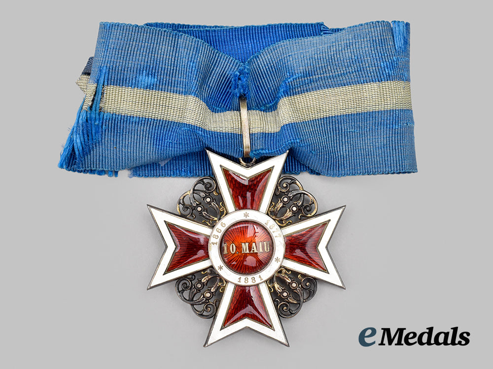 (Ordin "Corona Romaniei"). Instituted in 1881. Type I (1881-1941). Multi-piece construction, in silver gilt with red and white enamels, royal crown on the obverse centrepiece, measuring 61 mm (w) x 61 mm (h), chipping and loss evident in the white enamels on the obverse and reverse centrepiece rings, and in the red enamels on the arm at 3 o'clock on the obverse, on its frayed original full-length neck ribbon, fine.