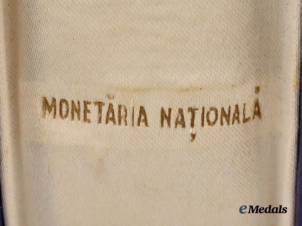 Contained in original case of issue, a dark blue leatherette case marked MI and “Coroana Romaniei Cavaler”, the interior silk lid marked MONETARIA NATIONALA, measures 60 mm (w) x 120 mm (h) x 23 mm (d), clasp functional, areas of wear, better than fine.