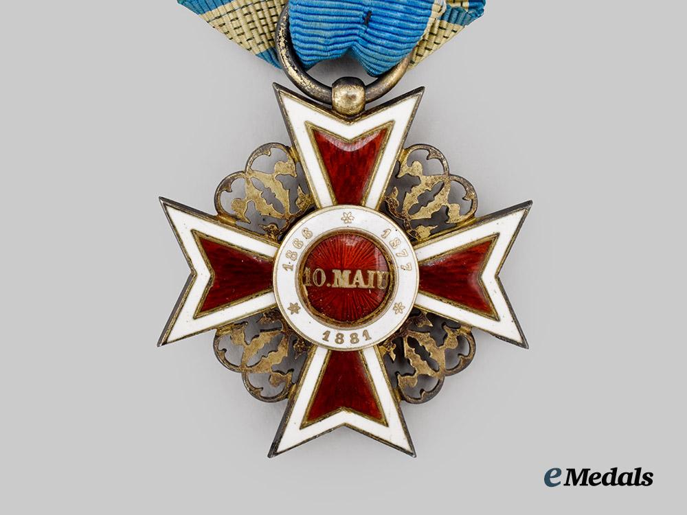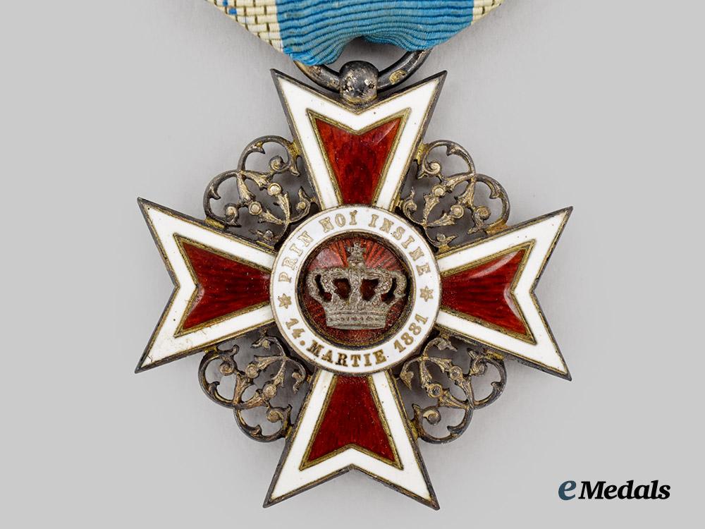 (Ordin "Corona Romaniei"). Instituted in 1881. Type I (1881-1941). In silver with red and white enamels, royal crown on the obverse centrepiece, marked with a Romanian silver mark denoting 750/1000 fineness and A mark denoting Vienna, measures 40.4 mm (w) x 41.2 mm (h), worn on original ribbon, enamel chip to obverse 9 o’clock arm, remains in very fine condition.