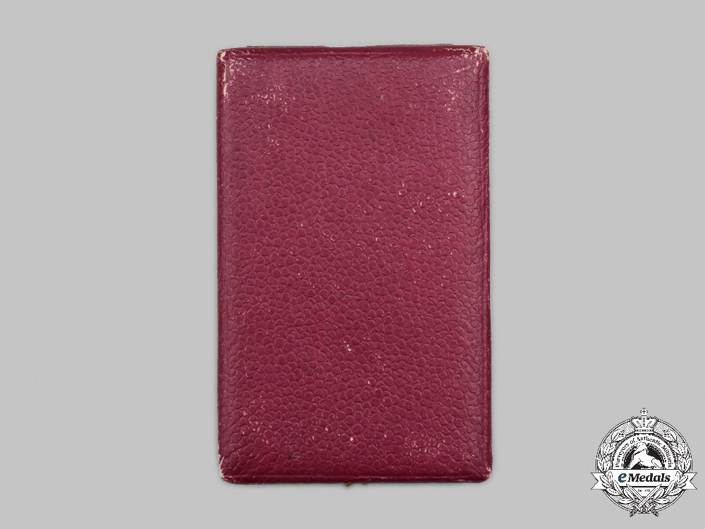 1943-1953. An extremely rare example in solid 14Kt. white Gold (unmarked, but tested), featuring red, blue and yellow enamels, measuring 32.3 mm, original ribbon, mounted to a five-sided metal suspension with pinback, in its hardshelled case of issue, near mint, and of extreme rarity.
