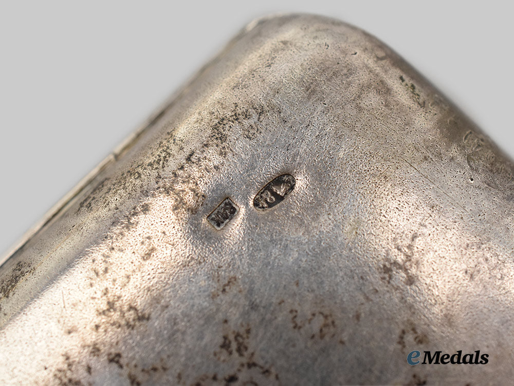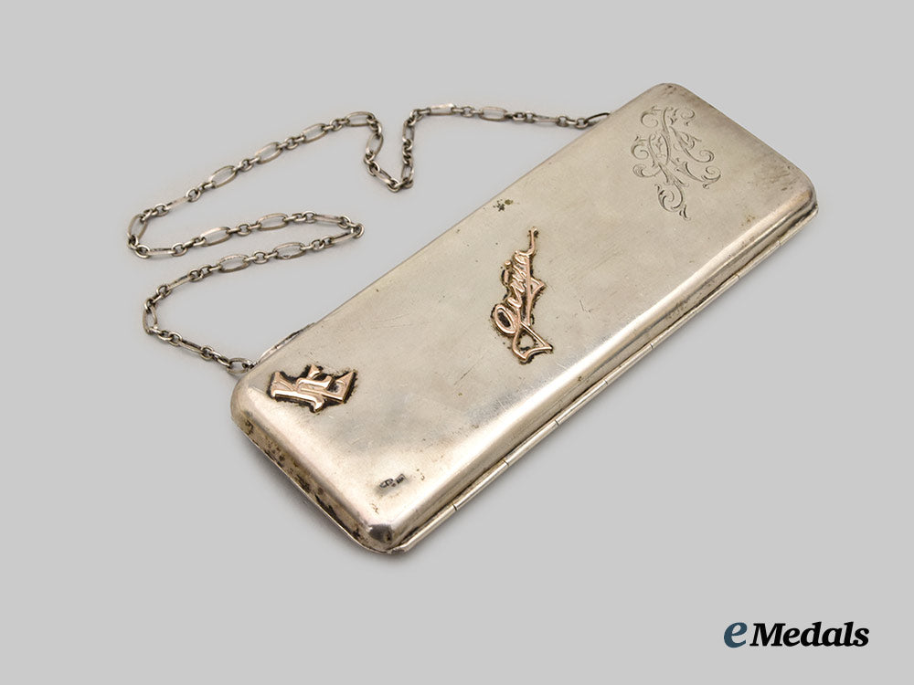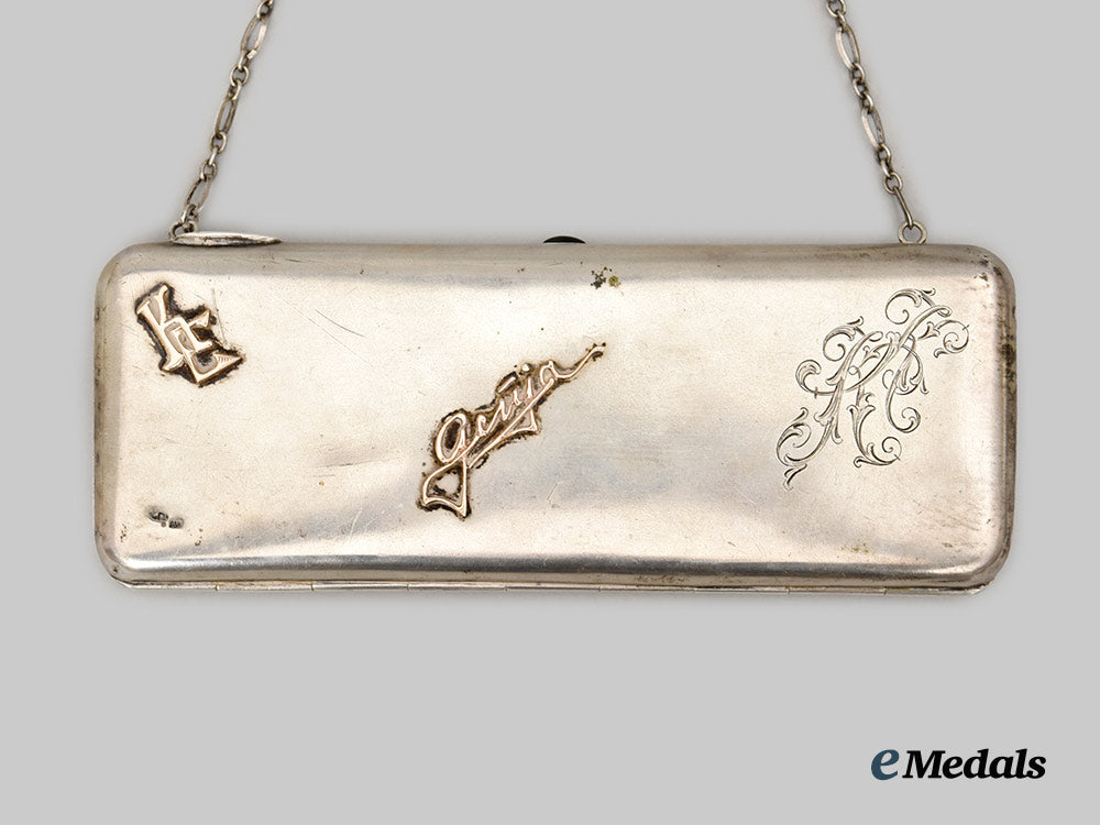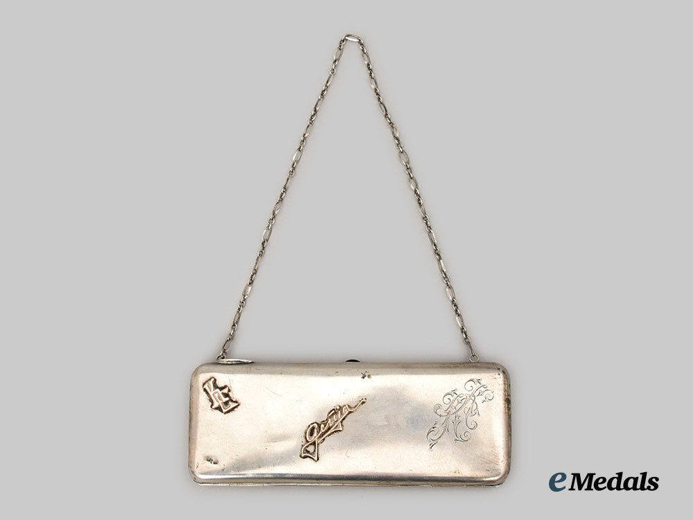 In silver, a lovely coin case with chain, the exterior presenting the raised initials KE and central name Genja in Gold, with an engraved KK initial on the right, the other side plain, two Russian kokoshniks on each side denoting Russian manufacture in Moscow (between 1908 and 1926) and .875 purity, with unknown BAK makers mark, the chain is connected by two integral rings at each edge, and consists of alternating ovular rings with three circular links, three rings marked with partial hallmarks of the Russian Kokoshnik, the case opens via a push button in the central featuring a green glass stone, the interior features three divisions maintained by rich green watered silk covered boards, measures 180 mm (w) x 70 mm (h)x 20 mm (d), weighs 301.3 grams, displaying light scratches and oxidation throughout, interior fittings slightly loose around edges, lasp functional, remains in very fine condition.