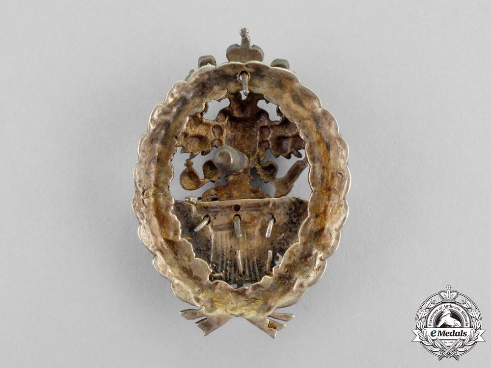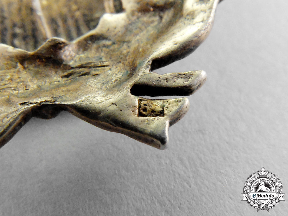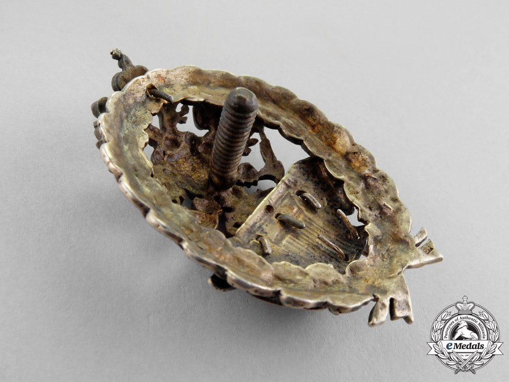 In silver, marked with the "84" silver standard mark on the reverse of the left ribbon on the wreath, measuring 37.5 mm (w) x 53 mm (h), intact screwpost, light contact, three fronting insignias slightly loose from badge having been apart and reaffixed, good/fine. [C:41]