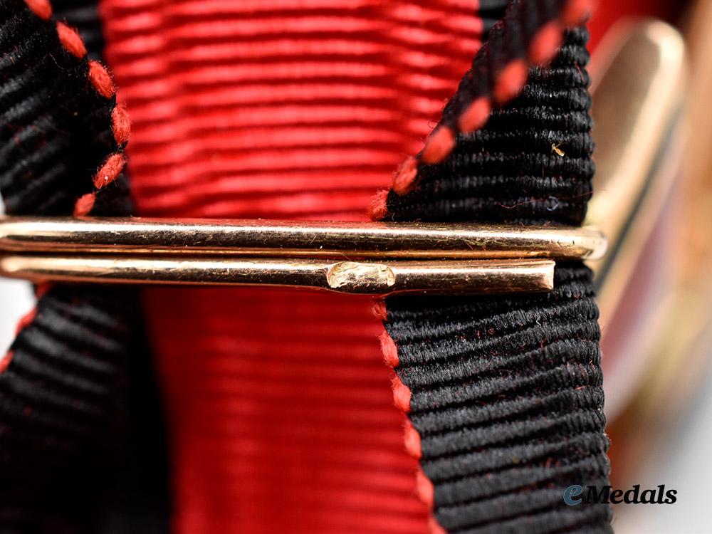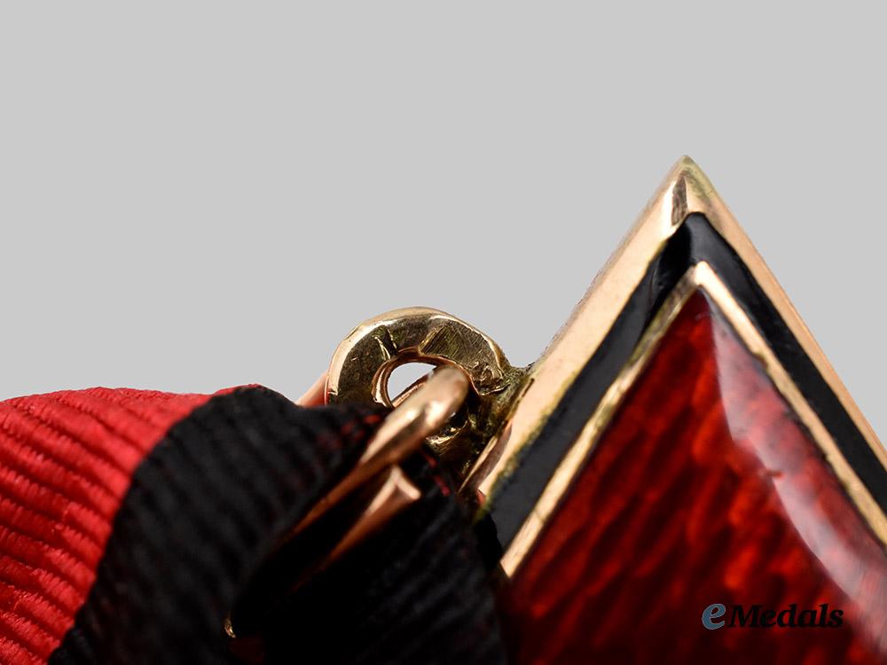 (орден Святого Владимира). Instituted September 22nd, 1782. In 14K Gold, a beautiful St. Vladimir in the form of a cross pattee with red and black thick enamel arms, swords piercing the central medallion delicately hand painted insignia, the reverse inscribed in Russian with the institution date “September 22, 1782”, on a loop for suspension from its correct modern replacement ribbon, marked with several kokoshnik marks on the sword hilts and suspension loop, measures 38.8 mm (w) x 43.5 mm (h), weighs 14.67 grams, worn on a correct replacement ribbon, small areas of enamel repair at the edge of the obverse 3 o’clock and reverse 9 o’clock arm, a lovely decoration in extremely fine condition.