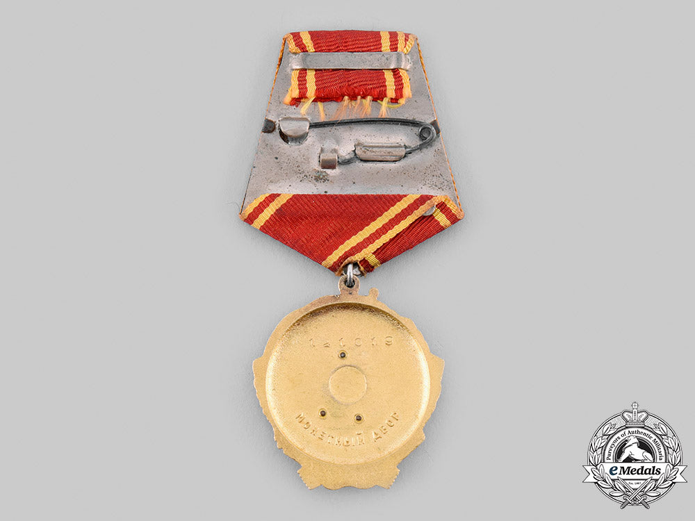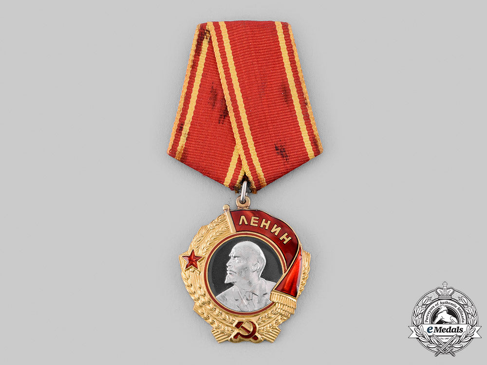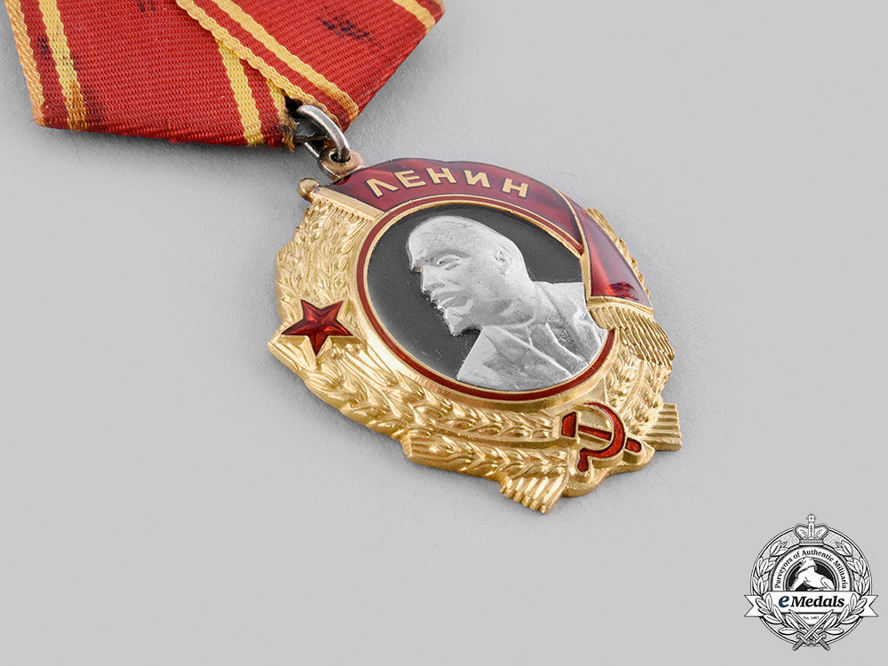 (Орден Ленин). Instituted in 1930. Type V, Variation 1. In Gold and platinum with red enamels, weighing 46.5 grams inclusive of its ribboned suspension, Monetny Dvor mint mark and number impressed "121019" on the reverse, measuring 38.5 mm (w) x 43.2 mm (h) inclusive of its integral ring, intact enamels, lightly soiled original ribbon, mounted to a five-sided magnetic metal suspension with pinback, extremely fine.