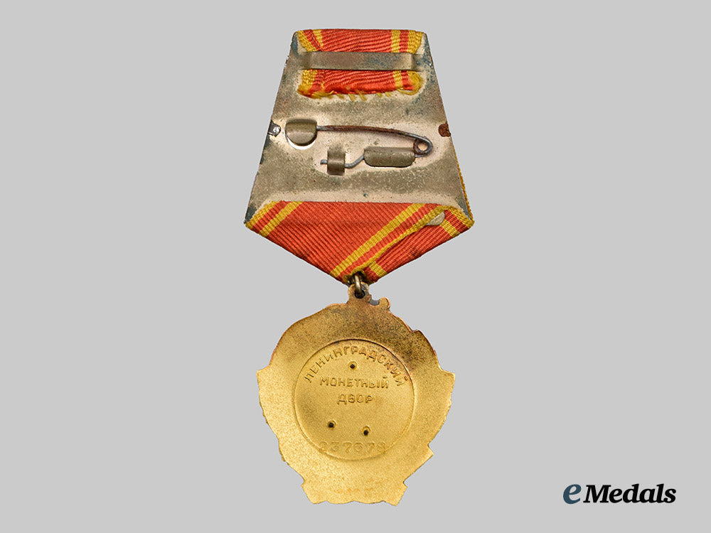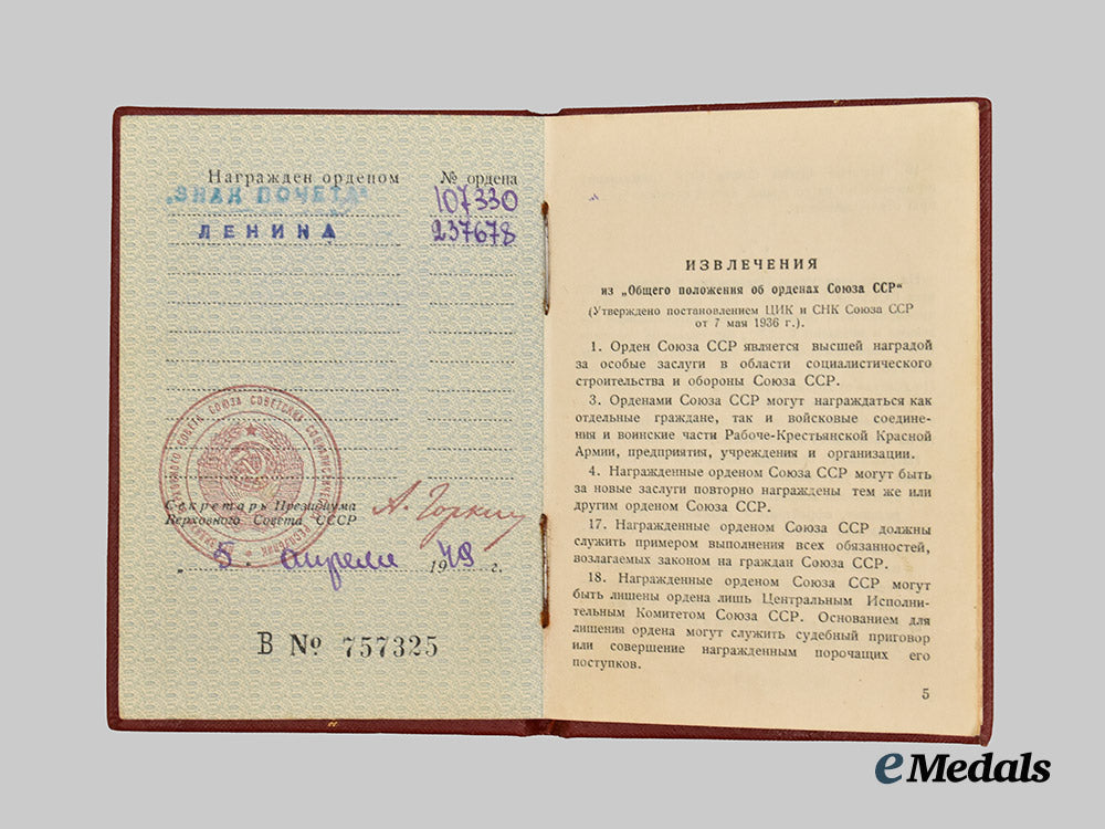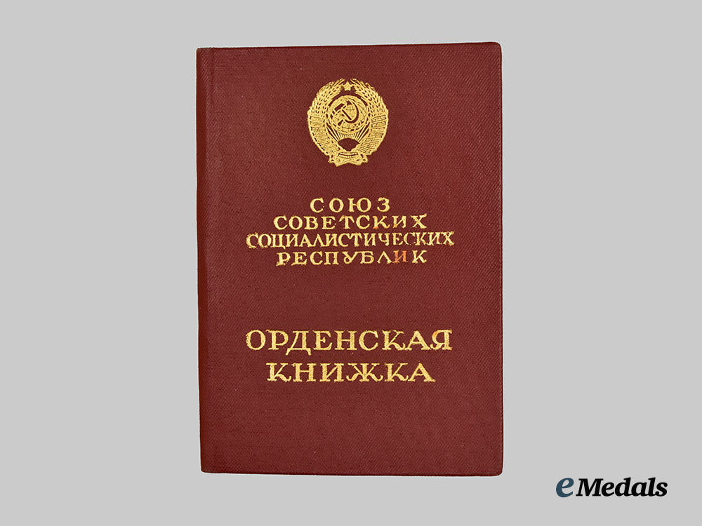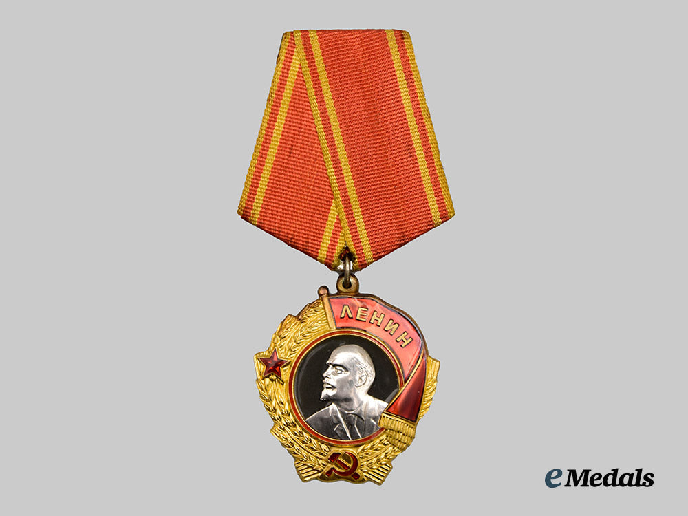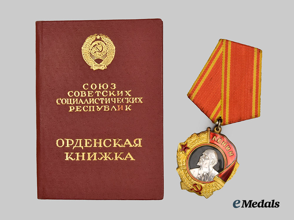 (Орден Ленина). Constructed of 23K Gold with platinum and multi-coloured enamels, the obverse consisting of a circular wheat stalk wreath, joined together at the bottom by a red enameled hammer and sickle, flanked on the right by a red enameled five-pointed star and on the left by a banner flag similarly executed in red enamel and bearing a gilt inscription of “ЛЕНИН” (“LENIN”), surrounding a central dark grey enameled medallion overlaid by a leftward-facing platinum profile of Vladimir Ilyich Lenin, the reverse with three visible rivets securing the image of Lenin in place, bearing a Cyrillic maker’s mark of “ЛЕНИНГРАДСКИЙ МОНЕТНЫЙ ДВОР” for the State Mint in Leningrad, situated above an award number of “237678”, topped by an integral loop and suspension ring retaining an original ribbon affixed to a pentagonal backplate with a horizontal pinback, measuring 39.23 mm (w) x 44.23 mm (h), weighing 46.5 grams (inclusive of ribbon and backplate), in extremely fine condition; accompanied by its matching award booklet, constructed of a card stock binding with interior pages lightly filled with handwritten and stamped entries, named to “ВАСИЛИЙ КИЛИЛЛОВИЧ ЗАХАРОВ” (“VASILY KIRILLOVICH ZAKHAROV”), featuring an entry for the Order of Lenin matching the serial number offered, in addition to an Order of the Badge of Honour, retaining a black-and-white photograph of Zakharov, measuring 7.5 cm (w) x 11 cm (h), in extremely fine condition.