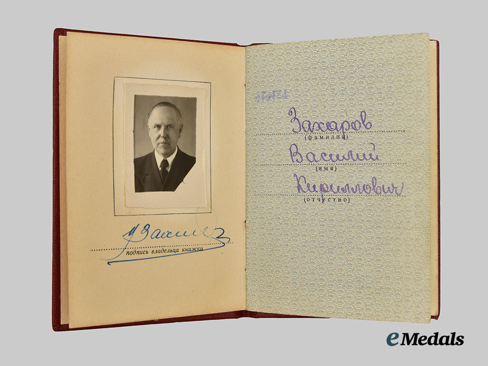 Russia, Soviet Union. An Order of Lenin, Type 6 in Gold with Award Booklet, to Vasily Kirillovich Zakharov