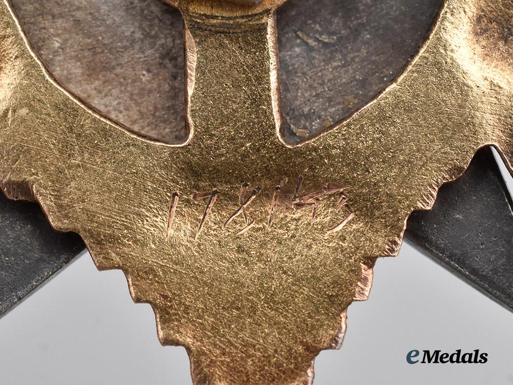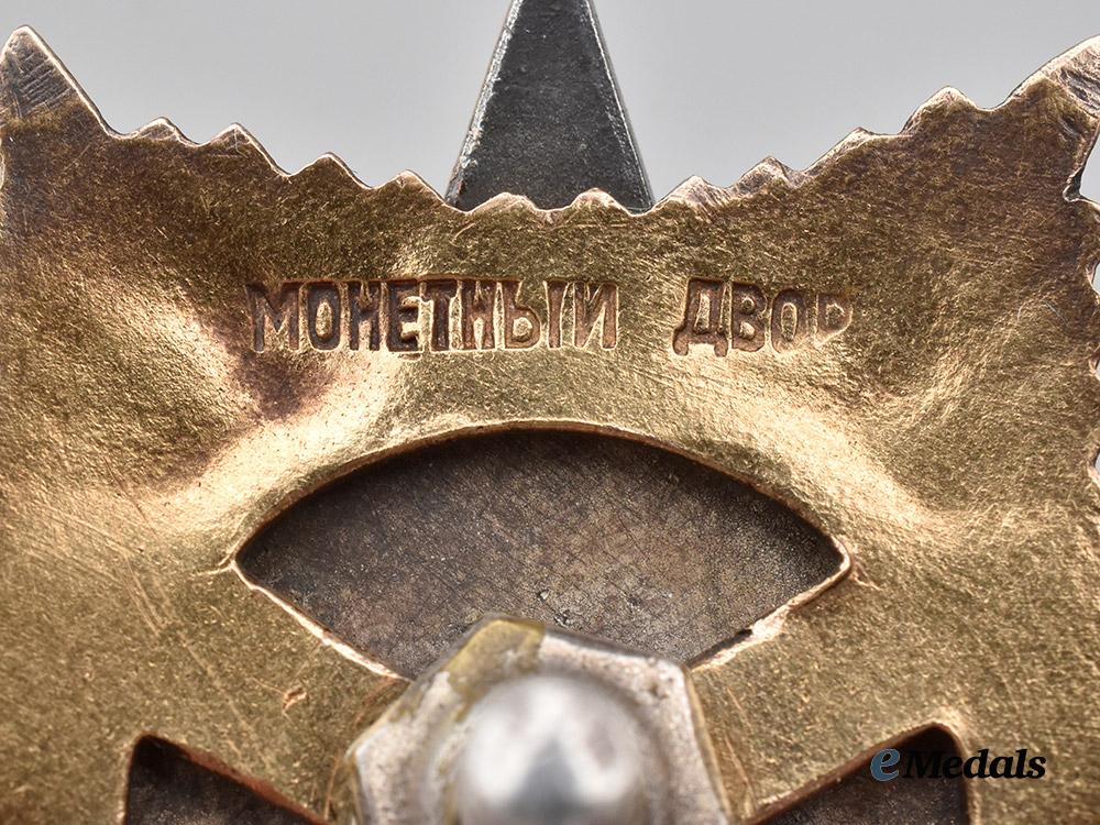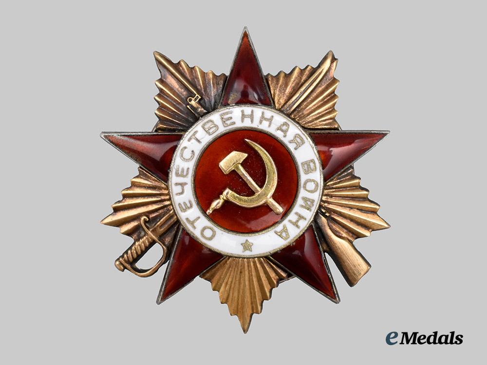 (Орден Отечественной войны / Orden Otechestvennoy Voyny). Instituted May 20th, 1942. (c. 1943 issue). Of three-piece construction of Gold, silver, and gilded silver, consisting of a red enameled five-pointed star with Gold straight rays (denoting I. Class) as well as a crossed saber and Mosin rifle in between the arms of the cross, with a central circular red enamelled medallion bearing a crossed Hammer and Sickle insignia in Gold, surrounded by a white enamelled ring inscribed “ОТЕЧЕСТВЕННАЯ ВОЙНА” (Patriotic War), the reverse with a screw-post and a threaded backing plate, mint marked "МОНЕТНЫЙ ДВОР" (Monetny Dvor) and number engraved "178143” by hand, measuring 43.8 mm (w) x 46.1 mm (l), weighing 37.34 grams, with small expertly executed enamel restoration to the center enamelled medallion, in better than very fine condition.