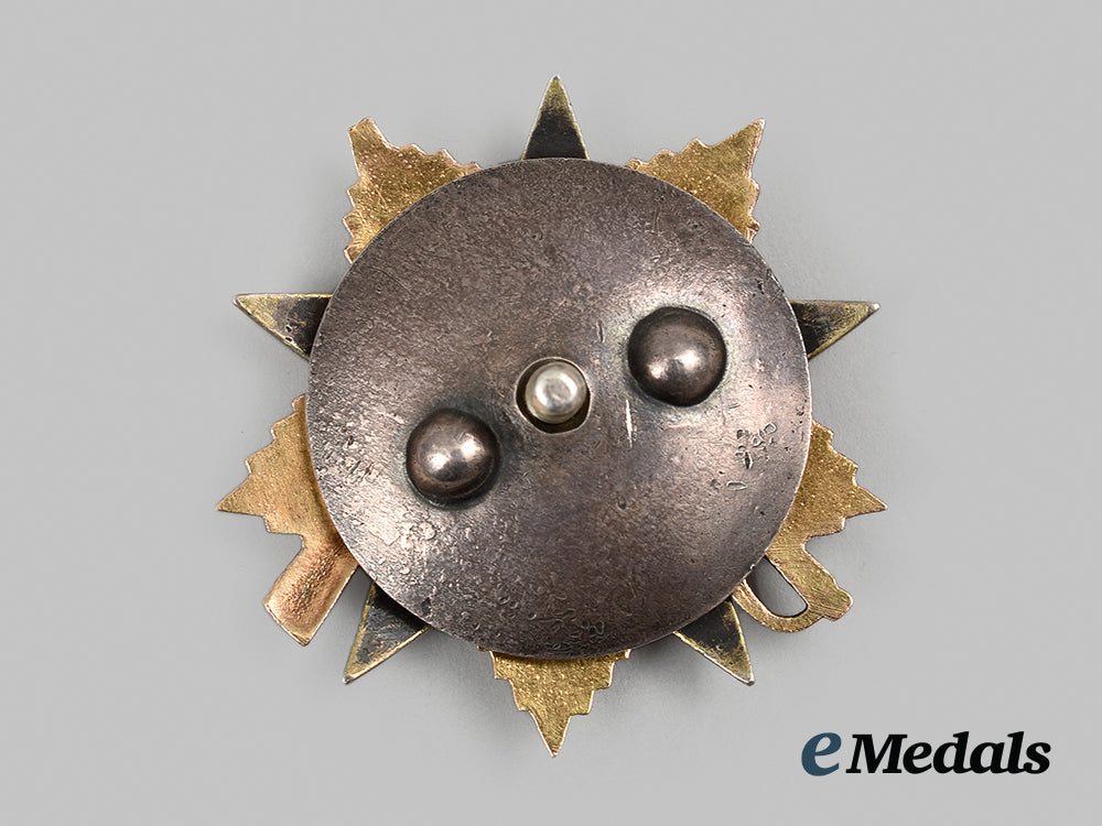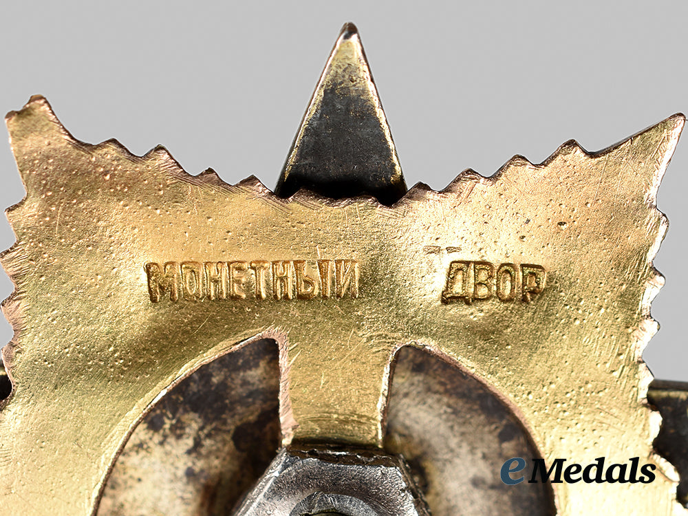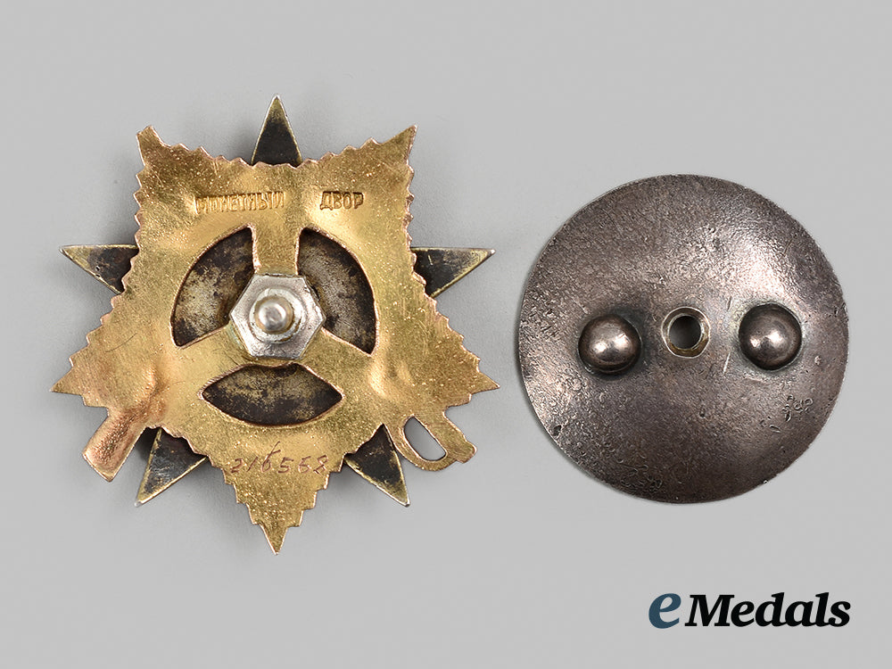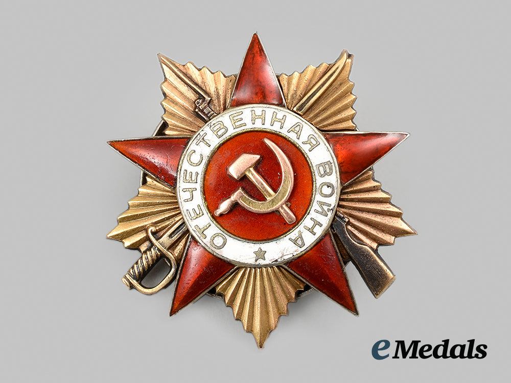 (Орден Отечественной войны). Instituted in 1942. Three-piece construction, the insignia in silver with red and white enamels and incorporating a hammer and sickle in Gold in the centrepiece, mounted to a five-pointed star base in Gold, each star point with nine emanating rays, weighing 38 grams, mint marked "МОНЕТНЫЙ ДВОР" (Monetny Dvor) and number engraved "216568" on the reverse, measuring 44 mm (w) x 45.8 mm (h), screwback, the insignia exhibiting multiple contact marks on the red enamels on the star point at 9 o'clock, along with chipping and crazing in the white enamels on the centrepiece ring at 6 o'clock, the remaining enamels intact, very fine.