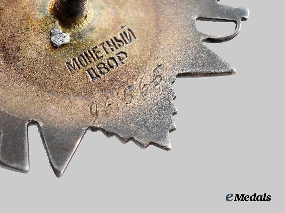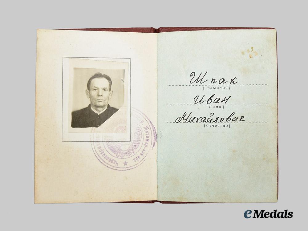 Constructed of a silver alloy with multi-coloured enamels, the obverse consisting of a five-pointed star with red enameled arms, with stylized rays emanating through the background, with a crossed sabre and Mosin-Nagant rifle piercing the centrepiece, bearing a central raised sickle and hammer, situated within a white enameled ring bearing an inscription of “ОТЕЧЕСТВЕННАЯ ВОЙНА” (“PATRIOTIC WAR”), the reverse with a central threaded screw post retaining an original backplate, maker marked “МОНЕТНЫЙ ДВОР” for the State Mint, and engraved with an award number of “961565”, in extremely fine condition, accompanied by an award booklet, featuring a recipient photograph, handwritten name of “ИВАН МИХАЙЛОВИЧ ШПАК” (“IVAN MIKHAILOVICH SHPAK”), and matching award entry, measuring 75 mm (w) x 110 mm (h), in extremely fine condition.