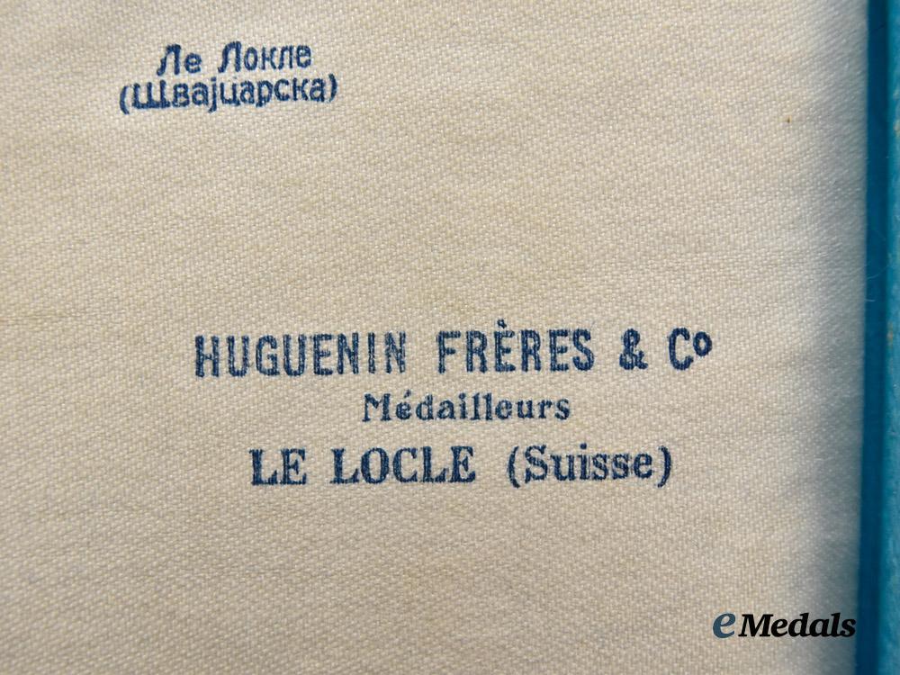 Accompanied by its presentation case, constructed of a lightweight wooden core with a light blue faux leather exterior, the exterior of the lid embossed with “CB. CABA. - III.” in gilt, with an intact and functional exterior metal hinge, with an intact interior fabric hinge cover, and functional exterior metal push-button closure, the interior of the lid embossed “Huguenin Frères & Co. of Le Locle Switzerland”, with a black recessed medal bed for comfortable seating of the award, measuring 94 mm (w) x 162 mm (l), in near extremely fine condition.