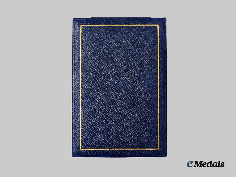 Constructed of silver with multi-coloured enamels, consisting of a St. Andrew’s Cross (Saltire), the obverse with blue enameled arms, overlaid by a central depiction of St. Andrew kneeling in prayer, topped by a crown, with a blue enameled banner emanating from the lower edge bearing Serbian Cyrillic inscriptions, the reverse with four visible rivets securing the saint and crown in position, the latter topped by an integral loop and suspension ring retaining a period original tri-fold ribbon with a horizontal pinback, maker marked “SPINK & SON LTD., 5. KING ST.” (indicating post-1927 manufacture), measuring 29.75 mm (w) x 45.48 mm (h), weighing 16.0 grams (inclusive of ribbon), accompanied by its period original presentation case, constructed of a wooden frame with a faux dark blue leather exterior liner, the interior with a padded white satin lid liner and intact hinge cover, the former bearing an additional Spink & Son maker’s mark, with a fitted off-white velvet medal bed, closing with a functional metal spring catch with exterior stud release, measuring 78 mm (w) x 115 mm (l) x 20 mm (h), demonstrating minor flecking and surface chipping to the enamels of the award, a scarce decoration in overall near extremely fine condition.