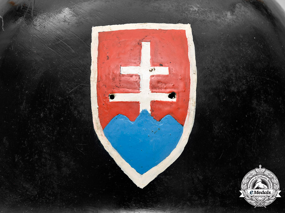 A very well-preserved Slovak Fire Brigade personnel steel helmet, constructed of a black-painted magnetic metal shell. A raised, polished magnetic metal comb is secured lengthwise to the crown with dual rivets. Three magnetic metal rivets are located along each side of the helmet, securing in place the interior features. Painted onto the peak is a fully-intact Slovakian coat of arms, measuring 45 mm (w) x 74 mm (h). The rim of the helmet is fully crimped, providing a smooth edge. A tan-coloured leather band fully encompasses the circumference of the interior, secured in place with the aforementioned rivets. Three suede and canvas fingers emanate from the band, each perforated at the top with two holes reinforced with magnetic metal grommets. A period original drawstring is securely looped through the fingers. An additional two-piece brown leather chinstrap is affixed directly to the sides of the shell with magnetic metal loops, and is adjusted with a functional magnetic metal buckle. The helmet is fully unmarked and measures 240 mm (w) x 270 mm (l) 150 mm (h). Issues consistent with age and use are evident, and include some oxidation of the metal features, as well as material fatigue of the leather and suede interior fixtures. The helmet is in an overall better than very fine condition.