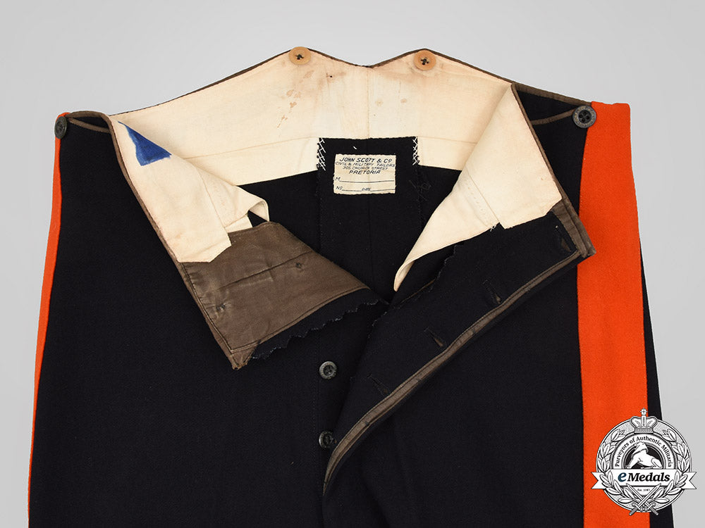A navy blue tunic with a red wool Mandarin-style collar with gilt trim around the edges, the collar has two hooks and two loops for closure, the centre right bears eight gilt brass shank buttons bearing the image of a crowned flying albatross, the reverse are marked “FIRMAN LONDON”, between the bottom two buttons are two metal hooks which attach to two metal loops on the interior left side of the garment, the centre left bears eight corresponding stitched reinforced buttoning holes, the centre left and right edge is piped with white fabric, the waist at the bottom button is horizontally stitched for attitional structure and vertically stitched 120 mm upwards twice on both the left and right panels, the left panel bears a bouillon SAAF wing, hand embroidered and the centre shield represents the four main ethnic and geographic regions of South Africa, below is a five place ribbon bar consisting of a 1914-15 Star, a British War Medal, a Victory Medal (South Africa), a King George V Silver Jubilee Medal and a 1937 King George VI Coronation Medal, measuring 165 mm (w) x 10 mm (h), halfway down the left panel are two stitches which medals may have been removed from the tunic, the shoulders bear shoulder boards consisting of white bases with gilt cord and red striped throughout, with two bullion thread shoulder board ciphers per board, one of a crown with red, blue and green detailing, the other a bullion rank pip with red, green and blue detailing, shoulder boards are fastened to the garment with a reverse strap and a gilt brass button, the sleeves bear three gilt brass shank buttons with the image of the crowned flying albatross, and are within a three pointed gilt trim with white piping and a horizontal strip of gilt trim and white piping, the reverse is stitched for additional detail and structure, the centre waist bears two gitl brass shank buttons with the crowned flying albatross and the waist at the back left and right sides bear a metal hook for a sword belt, the interior collar is lined with cream coloured fabric and bears four gilt attachment snaps, the left side bears a strip of navy felt, the interior body is lined with black fabric and the left interior panel bears a breast pocket with the label reading “HUMPHREYS & CROOK LTD 3 HAYMARKET S.W.I” in blue ink and hand written “2. 29 COL. SIR P. VAN RYNEVELD” in black ink, the sleeves are lined with cream coloured fabric, measuring 460 mm (across shoulders), 645 mm (shoulder to cuff) and 720 mm (total length); with navy blue pants, the outside of the left and right legs bear a single red stripe from waist to cuff, the waist is piped with grey fabric and is structured to have four points around the circumference, the front waist bears four black four-holed flat buttons marked “JOHN SCOTT & CO PRETORIA”, the left and right waist bear a shallow grey piped pocket, the bottom cuffs of the pants bear brown leather stirrups, one strip bears a standard metal buckle, the other strip bears four punched buckling holes, the pants do up in the centre front with six black four-holed flat buttons marked “JOHN SCOTT & CO PRETORIA” on the right side and the left side bears six corresponding stitched reinforced covered buttoning holes, the interior waist is lined with cream fabric and the back bears two cream coloured four-holed flat buttons, with an unmarked label reading “JOHN SCOTT & CO CIVIL & MILITARY TAILORS 305 CHURCH STREET PRETORIA”, measuring 435 mm (waist), 720 mm (inseam) and 1105 mm (outseam), in near mint condition.