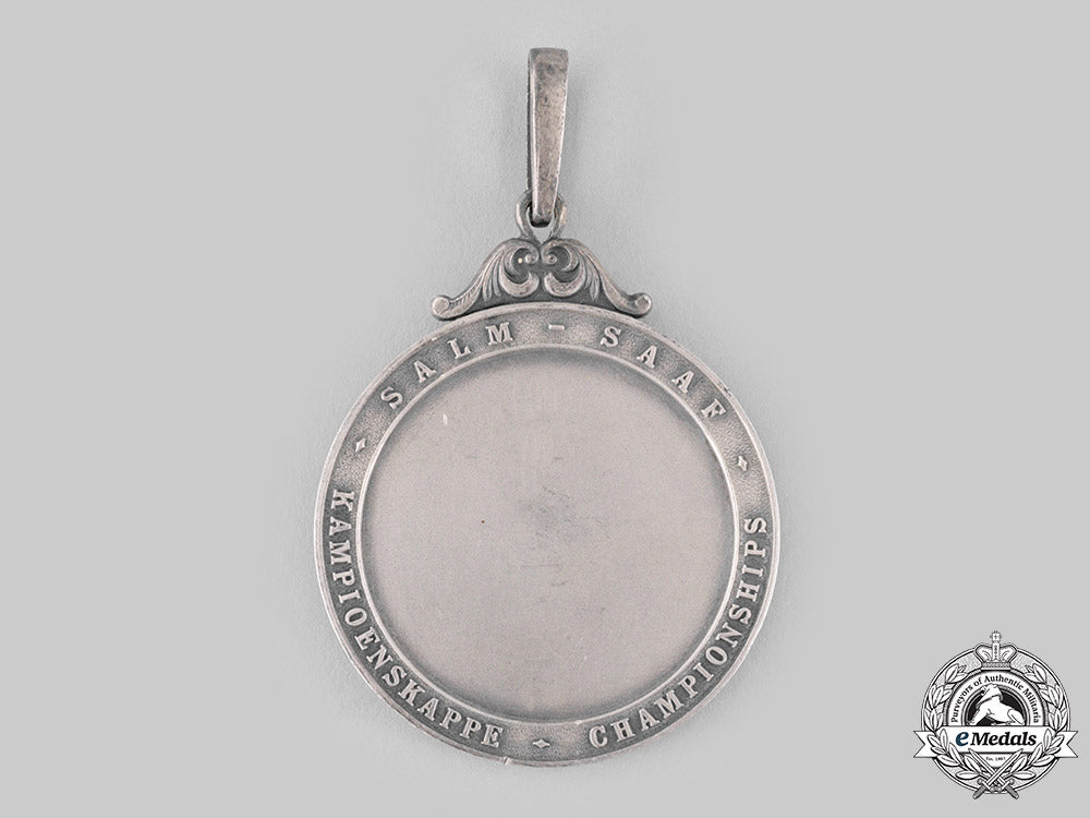 In silvered white metal, obverse illustrating the SAAF eagle insignia overlying an open-ended wreath of laurel leaves, reverse centre blank and surrounded by the inscriptions in Afrikaans and English "SALM - SAAF / KAMPIOENSKAPPE - CHAMPIONSHIPS", measuring 51 mm (w) x 63.8 mm (h) inclusive of its integral ring, loop suspension, very light contact, near extremely fine.