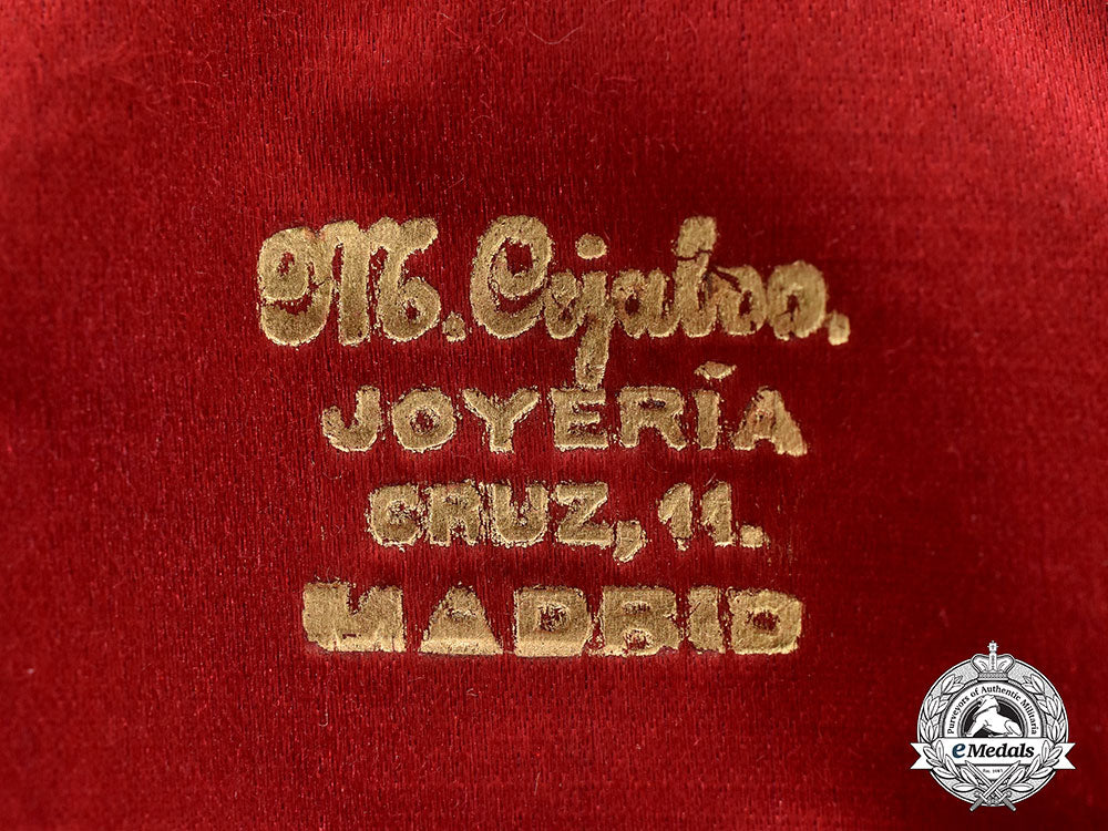 Contained in original clam-shaped case of issue, featuring an exterior brown leatherette impressed with the period Spanish coat of arms, the interior features a rich red silk lid impressed with makers mark M. Cejalvo. JOYERIA CRUZ 11 MADRID, with a pillowed medalbed, the case measures 89.8mm (w) x 96.4mm (l – including push button for clasp release) x 33.5mm (d), hinge and catch functional, light wear and discolouration throughout, however, remains in very fine condition.