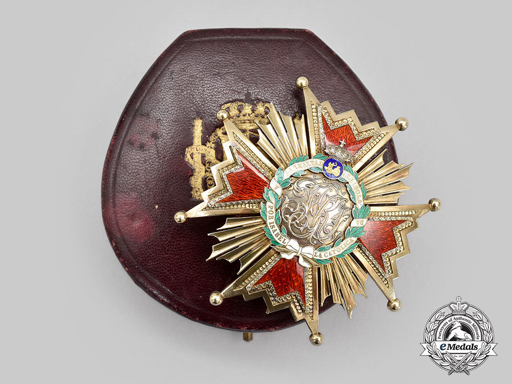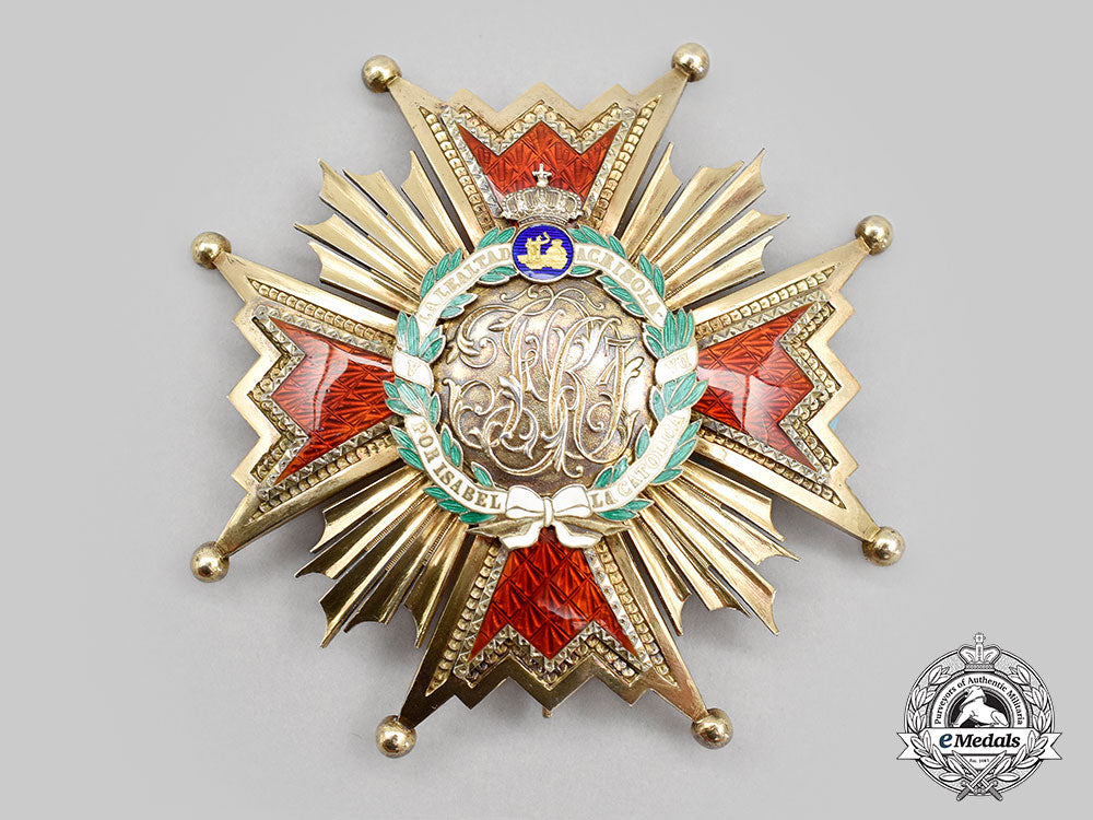(Orden de Isabel la Católica). Instituted March 24, 1815 by Royal Decree. A beautiful commander by number in silver gilt, featuring a four armed star with red enamel interior and large ball finials, between each quadrant sits five smooth rays, the obverse medallion features the cypher FR7, surrounded by a green enamelled wreath with white banner bearing the inscription A LA LEALTAD ACRISOLADA POR ISABEL LA CATOLICA (For the Pure Loyalty of Isabella the Catholic), a crown with small blue enamelled disc bearing the caraval and towers, the reverse presents a single vertical pin flanked by dual stays, measures 71.6mm (w) x 71.2mm (h), weighs 56.8 grams, very minor flaking to green enamel in wreath, in extremely fine condition.