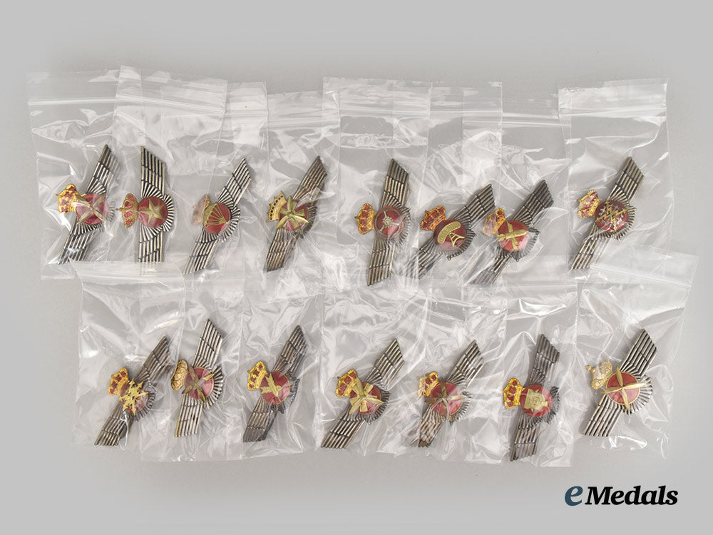 Includes: Automobile Mechanic, Bombardier/Weapons Specialist, Command, Cartography, two Flight Mechanic, Observer, two Pilot, two Pilot/Observer, Parachute Instructor, two Radio Operator/Mechanic, Stenographer badges. Each badge with the central insignia in bronze gilt or silvered metal, mounted to a circular base in bronze with red enamels, the insignia fronting a spread-winged base in silver or silvered metal. All fifteen badges are unmarked, surmounted by a crown, fourteen with royal crowns of Kings Juan Carlos I or Felipe VI of which twelve incorporate a gold-coloured gilt with red enamels, the other two with gilt, the remaining badge is a Flight Mechanic badge with a gilt Franco crown. The badges measure 93 mm in width x between 38.5 mm and 42.2 mm in height, fourteen with dual loop attachments on the reverse, of which eleven have locking swing plates, one of the Pilot badges with dual push pins, all with intact enamels, ranging from very fine to extremely fine.