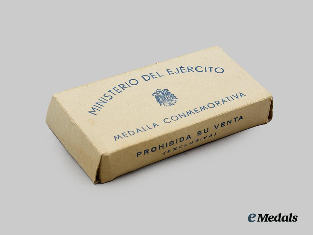 Constructed of silvered bronze with enamels, on loop for suspension from its period original ribbon with classic Spanish-style clasp and horizontal pinback, the obverse consisting of a Spanish national eagle, overlaid by a central 1939 Iron Cross, overlaying a circular laurel leaf wreath topped by a crown, the reverse consisting of a circular chain link wreath, surrounding a depiction of the Novgorod Kremlin above an inscription of “RUSIA 1941”, measuring 36.95 mm (w) x 51.46 mm (h), weighing 19.6 grams (inclusive of ribbon), accompanied by its original case of issue, constructed of card stock, bearing a maker’s mark of “DIEZ Y COMPAÑIA, S.A. - MADRID”, measuring 90 mm (w) x 45 mm (l) x 20 mm (h), a superb example in near mint condition.