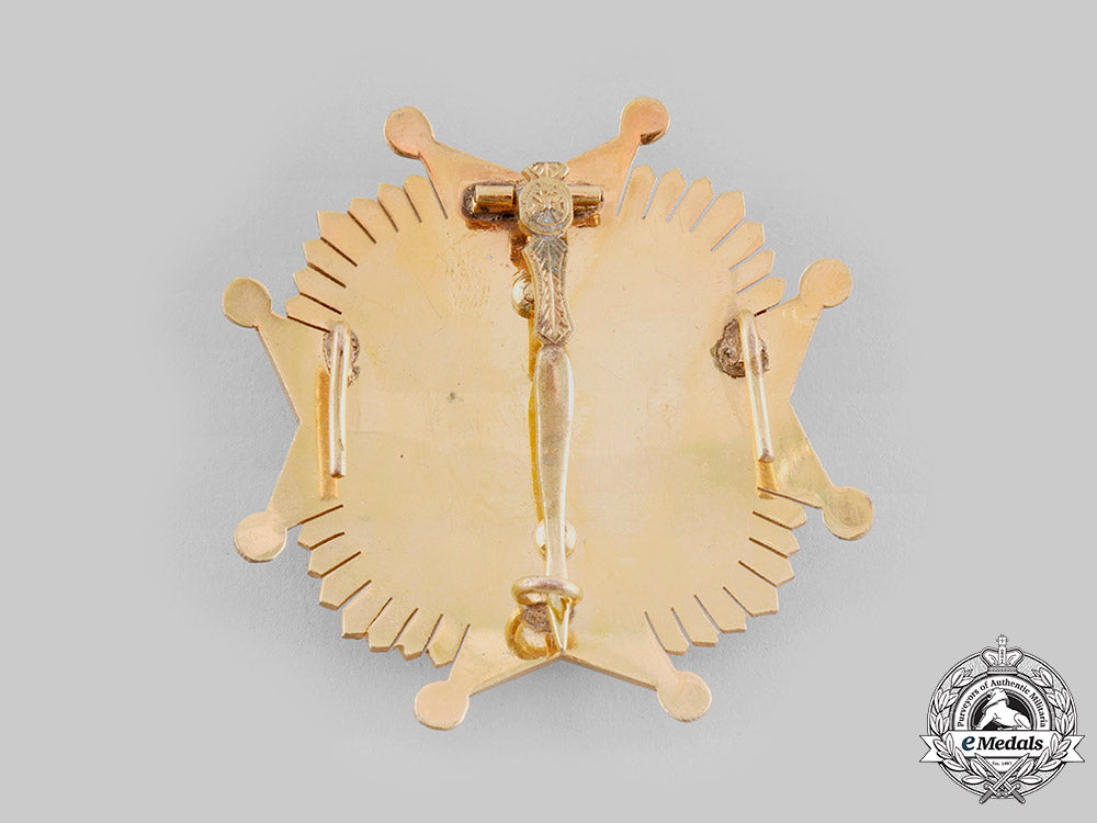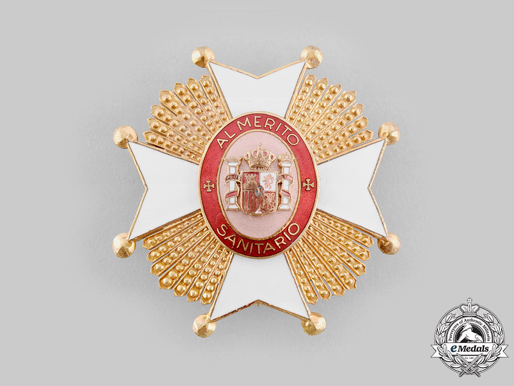 (Order al Mérito Sanitario). Instituted in 1943 by General Francisco Franco. Issued 1975-1995. In silver gilt, a ball-tipped Maltese Cross with enameled white arms, displaying multiple gilded rays in each quadrant, the obverse superposed by an enameled period Spanish coat of arms, within an enameled pink background, surrounded by an enameled red border inscribed AL MERITO SANITARIO (to Health Merit), the reverse with pin assembly and dual stays, measuring 60.40 mm (w) x 61.10 mm (h), light contact, near mint condition.