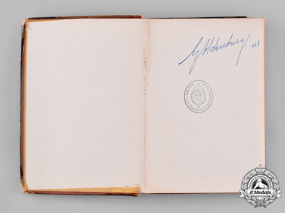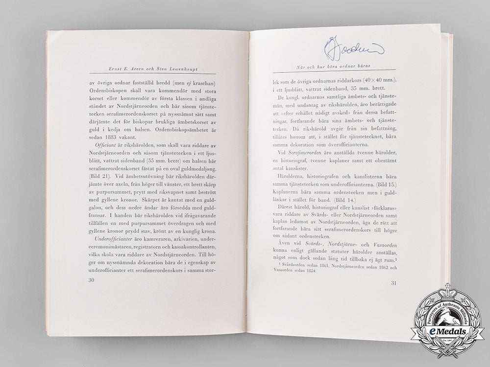 A lot of three books, including Nordiska Ordnar och Dekorationer (Nordic Orders and Decorations), by Arvid Berghman, published by John Kroon AB Malmö Ljustrycksanstalt, in 1949, in hardcover with case, containing 249 pages, with coloured and black-and-white illustrations, measuring 15.9 cm (w) x 23.4 cm (w), and in extremely fine condition. The Sweden Year-Book 1928, published in Stockholm in 1928 by Almqvist & Wiksells Boktryckeri, constructed of a red flexible leather-like cover with gilt lettering on the obverse, the interior page presents a stamp for the Consulate General of Sweden in New York, containing 283 pages, measuring 13.3 cm (w) x 19.0 cm (h), presenting heavy signs of period repairs along spine, and in good condition. När Och Hur Böra Ordnar Bäras (When and How to Arrange), by Ernst E. Areen and Sten Lewenhaupt, published in Eskilstuna in 1943 by J. O. Öberg & Sons, constructed of a paperback binding, containing 56 pages, with black-and-white photographs, measuring 13.7 cm (w) x 25.7 cm (h), with scuffing around the edges, and in very fine condition.