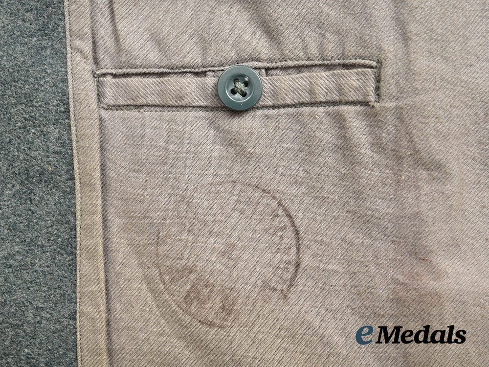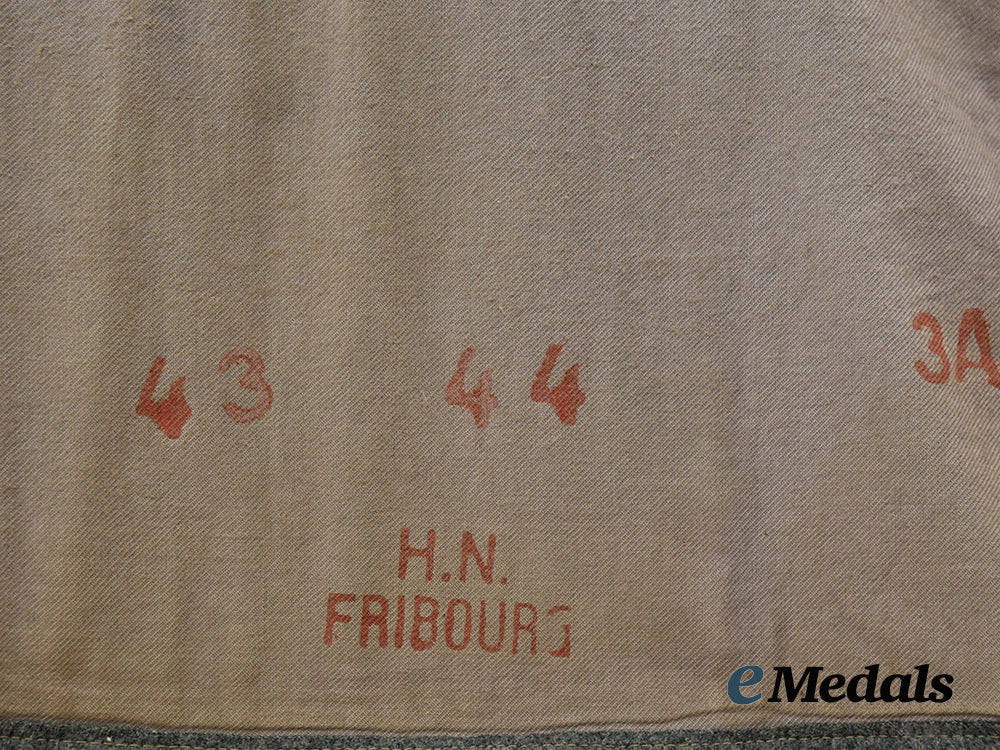 (Eine Dienstuniform eines Schweizer Artilleriesoldaten). This is a fine quality and extremely well preserved uniform set, consisting of a tunic and a pair of trousers. 1) The tunic is constructed of thick quality field-grey wool, with an up-turned collar, flanked on both sides by red collar tabs, constructed of a buckram core, with a red wool upper, measuring 65 mm (l) x 32 mm (w). The shoulders are decorated with sew-on shoulder boards, secured to the shoulders via a single pebbled button featuring a Greek cross. This tunic features four pockets in total; two pleated breast pockets, and two pleated waist pockets. All are secured shut via a flap, with the breast pockets additionally secured via a green bakelite button. The cuffs feature a slit that is secured shut with a series of three buttons per sleeve. Each cuff is also decorated with a tab, constructed of red wool, with a set of crossed cannon barrels machine-embroidered in black on the obverse, measuring 128 mm (w) x 38 mm (l). The tunic closes in the front with six matching gilded bronze buttons, decorated with a Greek cross, that meet an equal number of reinforced buttonholes on the opposing side. The sides of the interior are lined with a grey multi-piece cotton liner, with the body and sleeves completely unlined. The liner is stamped “43, 44, 3A” and “H.N. Fribourg” in red ink. It measures approximately 43 cm across the shoulders (seam to seam), with a sleeve length of 61 cm, and an overall body length 77 cm. 2) The accompanying trousers are constructed of matching field-grey wool, with one vertical-slit pocket per side, and with one horizontal-slit pocket on the right side of the reverse, all secured shut via a single bakelite button. The front is secured shut in the middle via a series of three vertically mounted green bakelite buttons that are met with an equal number of reinforced buttonholes on the opposing side. The waist is ordained with six green bakelite buttons on the exterior for the attachment of optional suspenders, with an integral belt with metal hardware in the center of the reverse for size adjustment. This pair is unlined, with the exception of the waist and the interior of the pockets, which are lined in matching grey-coloured cotton fabric, and stamped “74” in matching red ink. Each cuff has a 18 cm long slit in them, secured shut by a series of four buttons per side. The pair of trousers measures 41 cm across the waist (seam to seam), with an inseam of 72 cm, and an overall length of 100 cm. This uniform pair is extremely well preserved, with only light wear to the collartabs on the tunic, but otherwise free from obvious wear, in overall better than extremely fine condition.