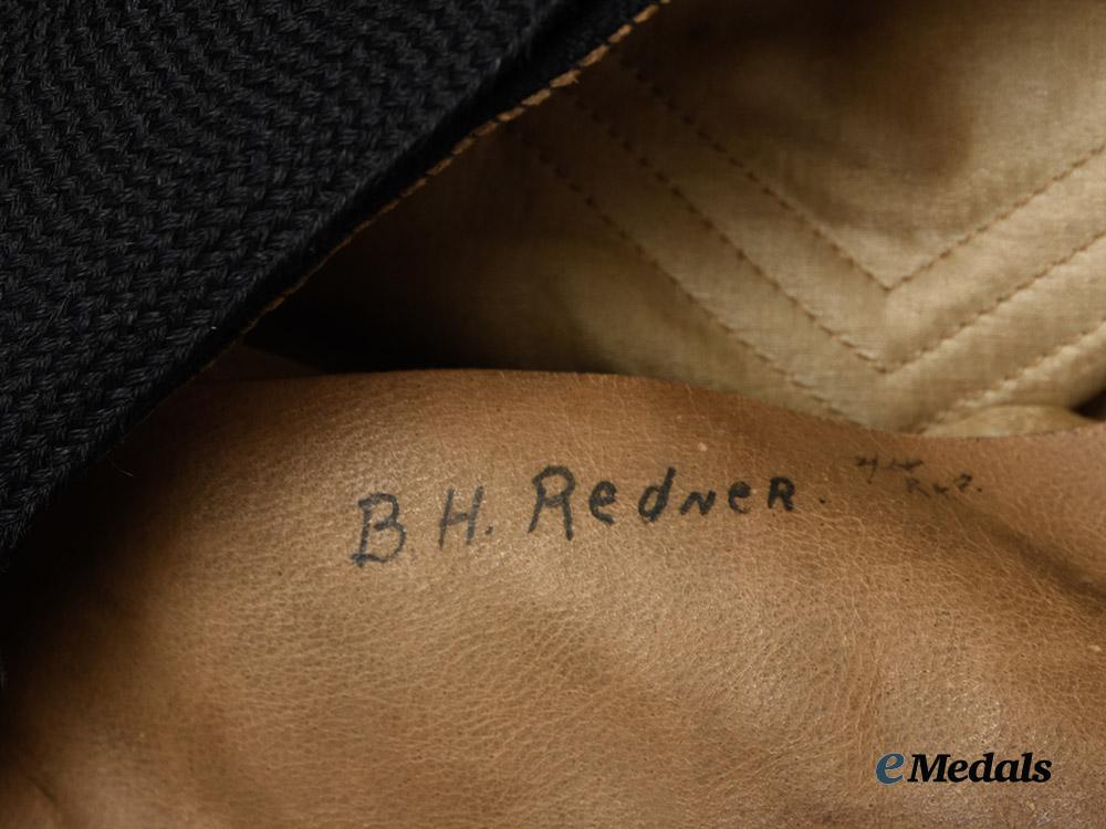 Brown cotton exterior, the classic high peak, wide black wool band around its circumference, the Pilot's insignia in bronze gilt consisting of three pieces: the King's crown surmounting a spread-winged eagle and two branches at the base forming a wreath, the void of the crown in deep red felt at the front, stiff vulcan fibre visor upper in black with a black patent leather strap with two length adjusters running across the front between the brown fabric-covered button posts on both sides, the underside of the visor in forest green, inside with a light brown sweatband, name inscribed "B.H. Redner" in handwritten black ink on the left side, the ends of the sweatband tied together at the rear and bearing a bow-tied brown ribbon, the dome lined in beige cotton, with a diamond-shaped manufacturer's mark that is no longer legible, with a size stamp in green ink nearby, measuring 230 mm (w) x 250 mm (d) x 140 mm (h), with crazing evident on the vulcan fibre visor, along with light soiling overall. Fine.