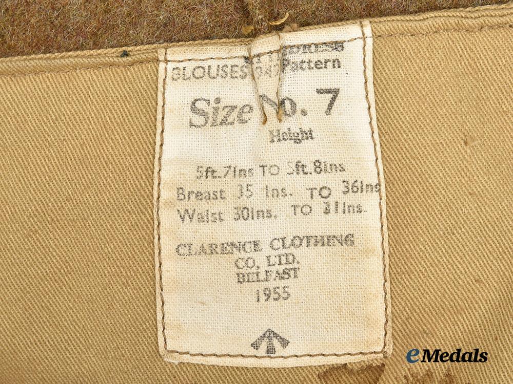 A very well-preserved battledress assembly to a decorated Lieutenant Commander of the Royal Navy Commandos, constructed of olive-drab wool twill. It features a narrow turned-down collar reinforced along the reverse with machine-embroidered darts. The shoulders are flanked by olive-drab straps overlaid by a rank insignia constructed of dark navy blue wool with three bullion wire tresses culminating in a rosette, measuring 60 mm (w) x 150 mm (l), and fixed in position with bakelite buttons. Each shoulder also bears a Second World War-period title constructed of a dark blue wool baser and bearing an off-white stitched inscription of “ROYAL NAVY COMMANDO”, measuring 100 mm (w) x 40 mm (h). The right sleeve also features a Parachutist Badge, constructed of an olive-drab wool base with off-white and light blue machine-embroidered, measuring 75 mm (w) x 30 mm (h). The cuff of each sleeve closes with a single olive-drab bakelite button. Each breast has a single pleated pocket closing with an olive-drab bakelite button. Stitched onto the battledress just above the left pocket is a ribbon bar featuring four decorations, including a Distinguished Service Cross, a 1939-1945 Star, an Atlantic Star and a War Medal 1939-1945. It closes with five bakelite buttons and an integral belt emanating from the right side. The interior retains a fully-intact manufacturer’s label bearing a maker’s mark of “CLARENCE CLOTHING CO. LTD. BELFAST”, a date of “1955”, size dimensions corresponding to the wearer’s height and measurements (suited to a wearer between 5'7"-5'8", with a chest size of 35 inches-36 inches, and a waist size of 30 inches-31 inches), and an additional mark indicating that the garment is a 1947 pattern example. Demonstrating minor and sporadic soiling and material fatigue, this post-war assembled battledress to a decorated veteran of the Atlantic Campaign remains in a near extremely fine condition.